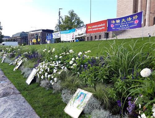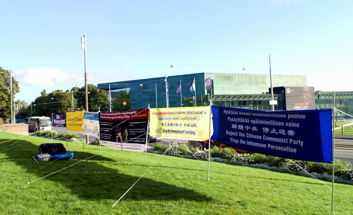 芬兰法轮功学员立起了长达十八米的双面横幅,一面向首都市中心的马路上络绎不绝的车辆展现,横幅的另一面对着国会大厦,从国会大厦里一眼就能看到横幅上的信息。由于法轮功学员长期在首都赫尔辛基和其它城市举办活动,声誉一直很好,活动当天连巡逻的警察都没有,议会的保安也很放心,并友好的跟学员打招呼。