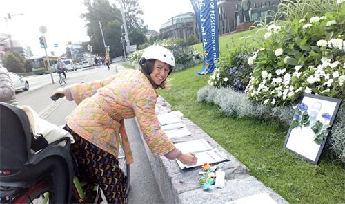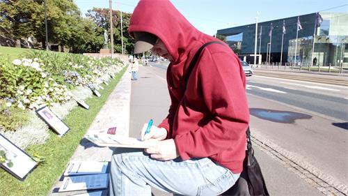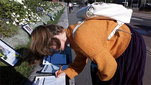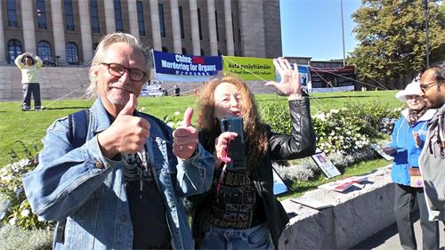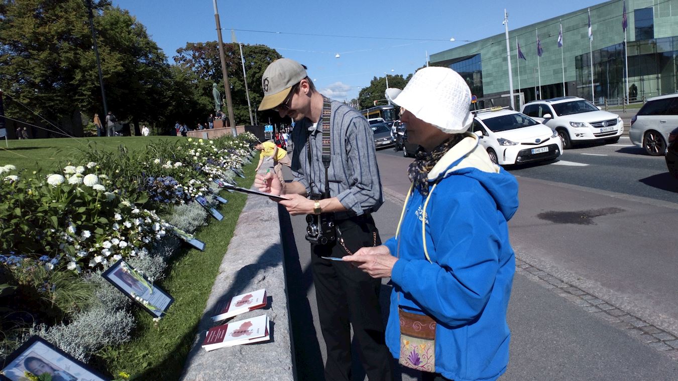 学员跟一对夫妇讲:“作为法轮功学员,想呼吁更多的人关注法轮功被中共残酷迫害。”跟他们坐一排的人都竖起耳朵听,都表示要签名支持法轮功。其中有一位女士告诉她的朋友说:“在西贝柳斯公园经常看见他们在那里炼功。那边有很多中国游客,但是那些人在中国得不到真实的信息。他们(法轮功)就是让中国人看见(真实信息)。”其中一位将近七十多岁的先生说:“这是很重要的事情。是很重要的人权问题。”