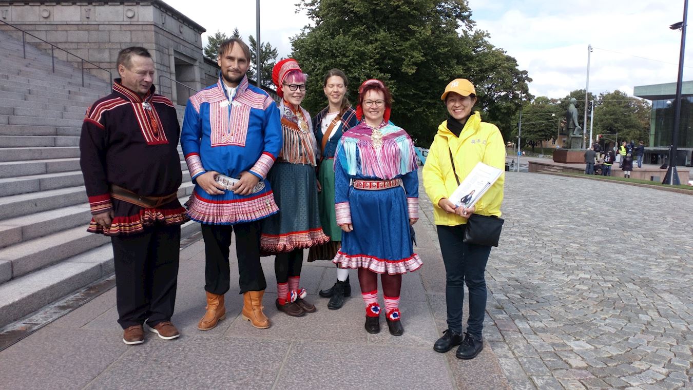 敏娜(Minna)同其他四位萨米人和一名摄影师一起到国会与议员碰面。萨米人是北欧地区的原住民,欧洲最大的原住民族群之一,也是欧洲目前仅存的游牧民族。他们在国会大楼前留影。学员上前跟他们攀谈,他们都签了名支持法轮功。