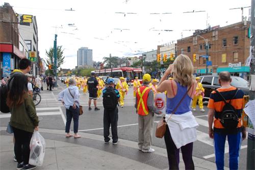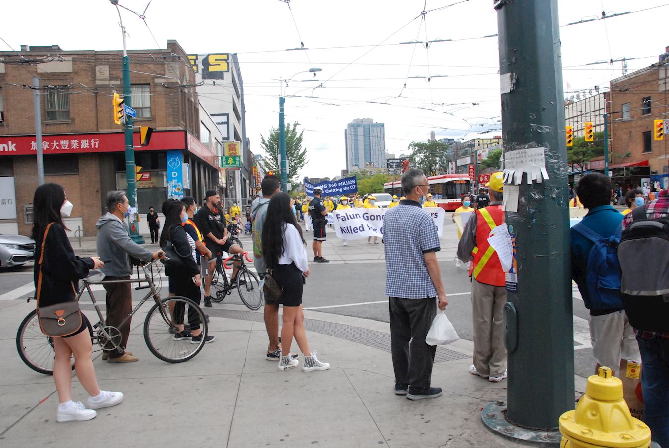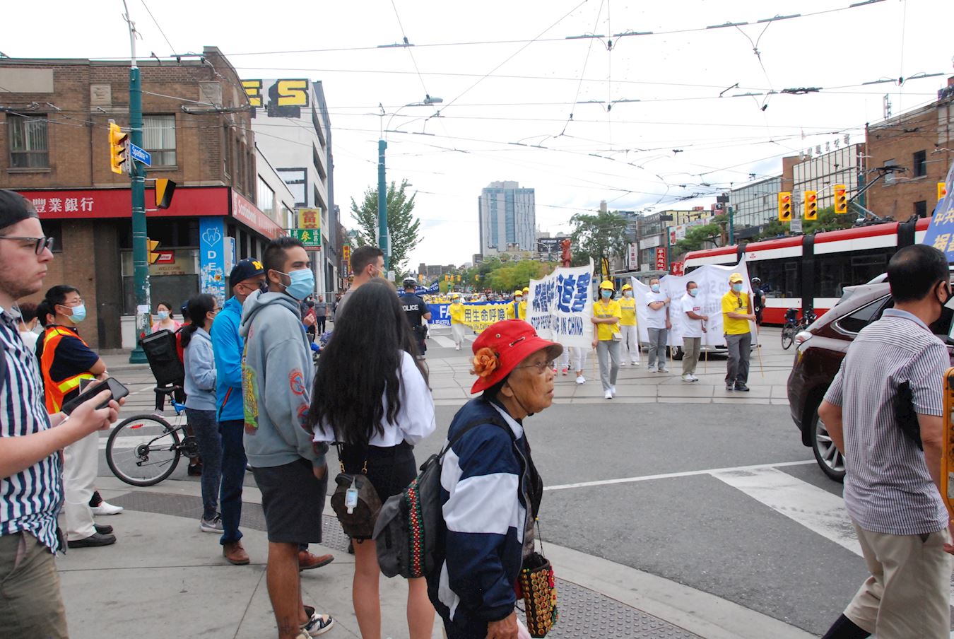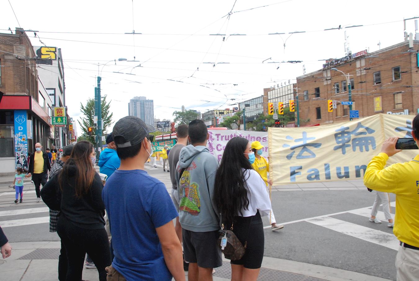 多伦多大游行队伍由多伦多天国乐团、炼功方阵、法轮大法好方阵、反迫害退!党!方阵、三个真相车队和腰鼓队组成。由于当前仍处于疫情期间,为了符合安省关于户外人数的限制和社交距离,游行队伍分成了以上的方阵,同时为了让方阵与方阵之间保持较大的距离,在各个方阵之间穿插了三个真相车队,这样,虽然参加游行的法轮功学员数目有限,但是整个游行队伍却浩浩荡荡,非常壮观。游行前的集会中,五位中国人在当场勇敢的宣布三:退.。游行途中,很多华人现场观看并声明三:退.;也有华人明白真相后现场踊跃支持,更有西方观众现场进行正义支持。