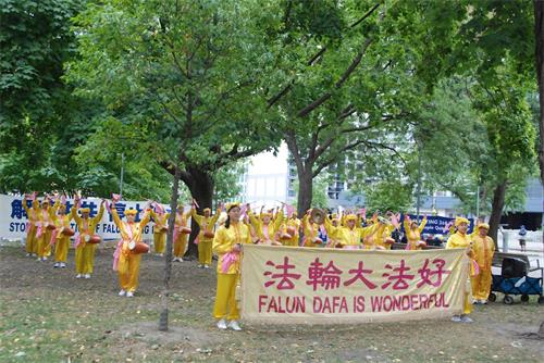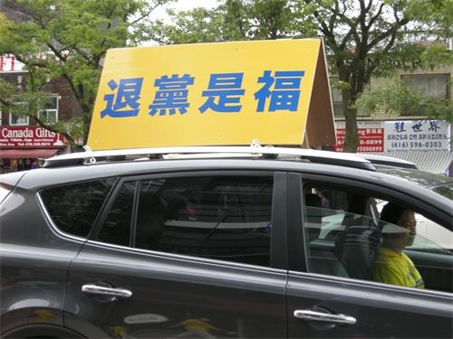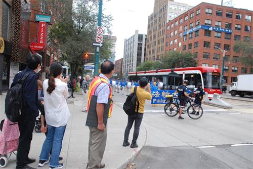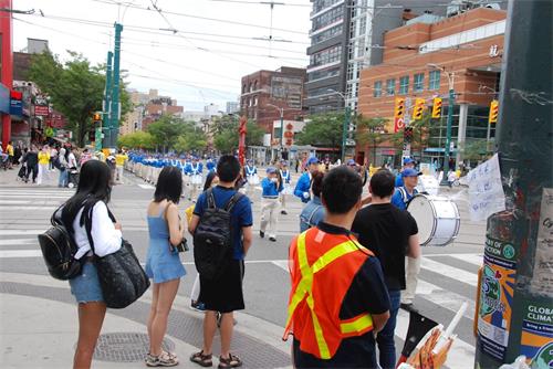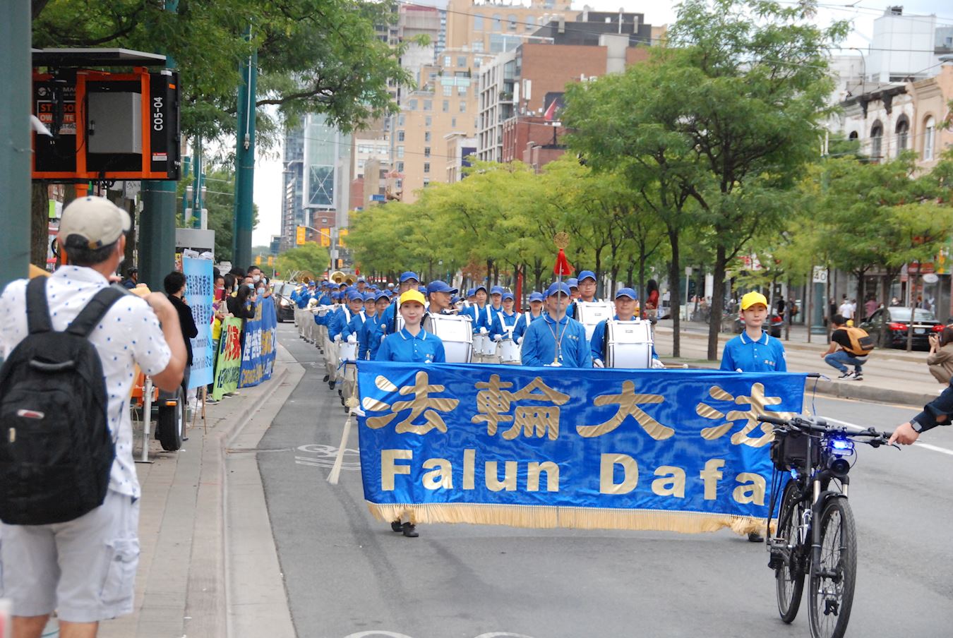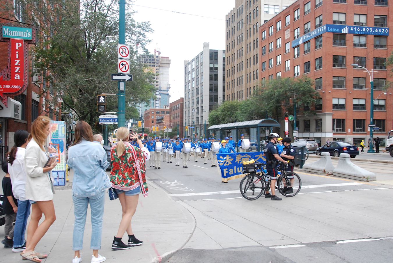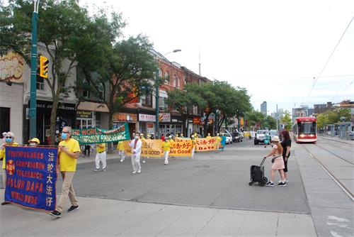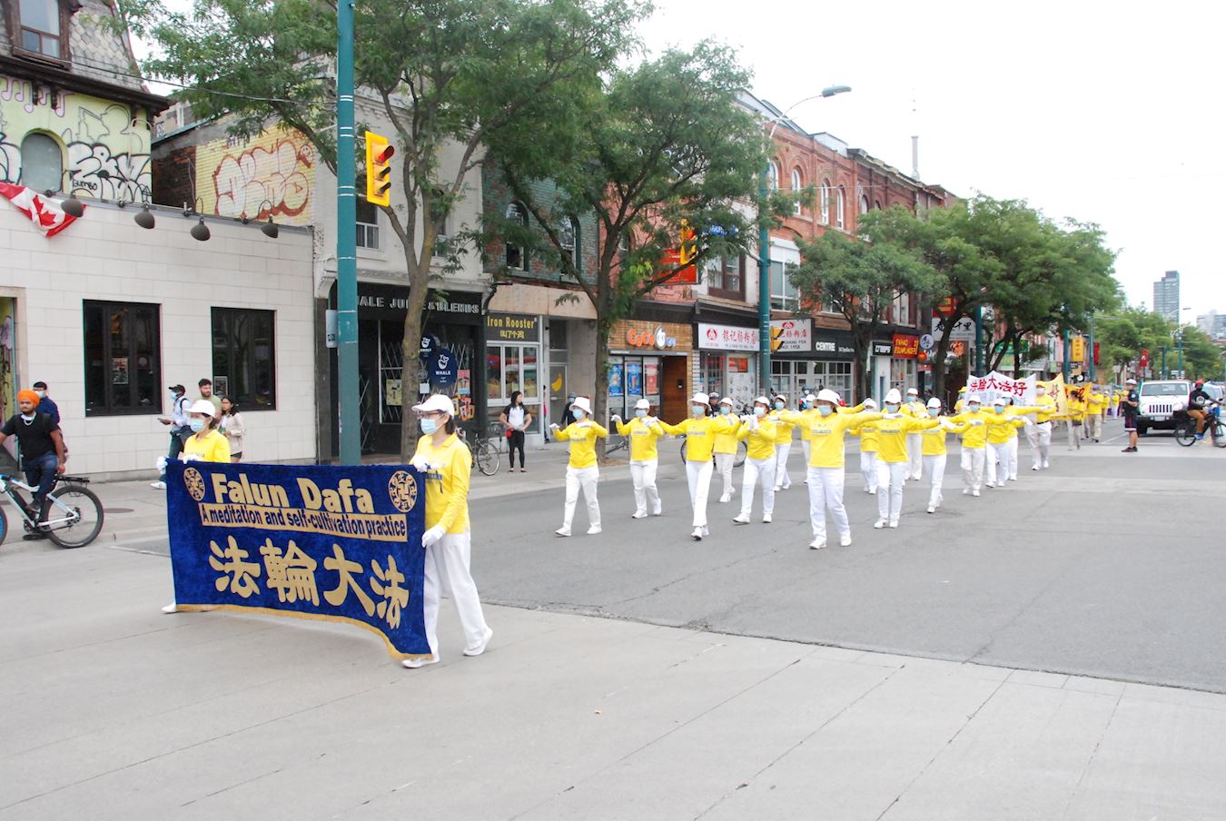 多伦多大游行队伍由多伦多天国乐团、炼功方阵、法轮大法好方阵、反迫害退!党!方阵、三个真相车队和腰鼓队组成。由于当前仍处于疫情期间,为了符合安省关于户外人数的限制和社交距离,游行队伍分成了以上的方阵,同时为了让方阵与方阵之间保持较大的距离,在各个方阵之间穿插了三个真相车队,这样,虽然参加游行的法轮功学员数目有限,但是整个游行队伍却浩浩荡荡,非常壮观。游行前的集会中,五位中国人在当场勇敢的宣布三:退.。游行途中,很多华人现场观看并声明三:退.;也有华人明白真相后现场踊跃支持,更有西方观众现场进行正义支持。