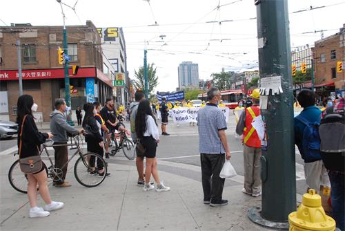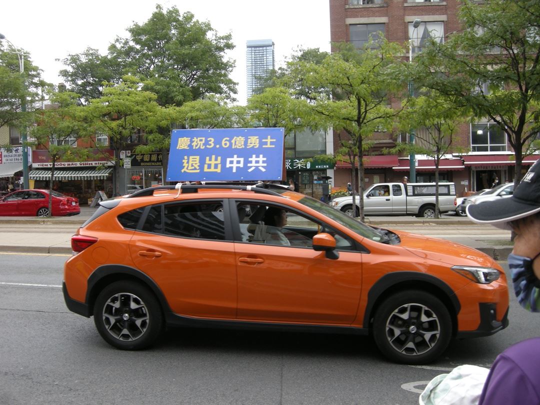 当游行队伍经过多伦多的唐人街时,吸引了很多在这里工作或购物的中国人前来观看。法轮功学员王女士看到有四位中国人正在路边观看大游行,她给这四位中国人讲了法轮功真相,同时讲到了由于中共对新冠病毒肺炎疫情的隐瞒,而导致的现今的肺炎疫情全球大爆发的现状,并真诚的告诉他们退出中共的党团队,远离邪恶就能得到神佛的佑护、从而躲过瘟疫的道理。四位华人都高兴地同意了三:退.。