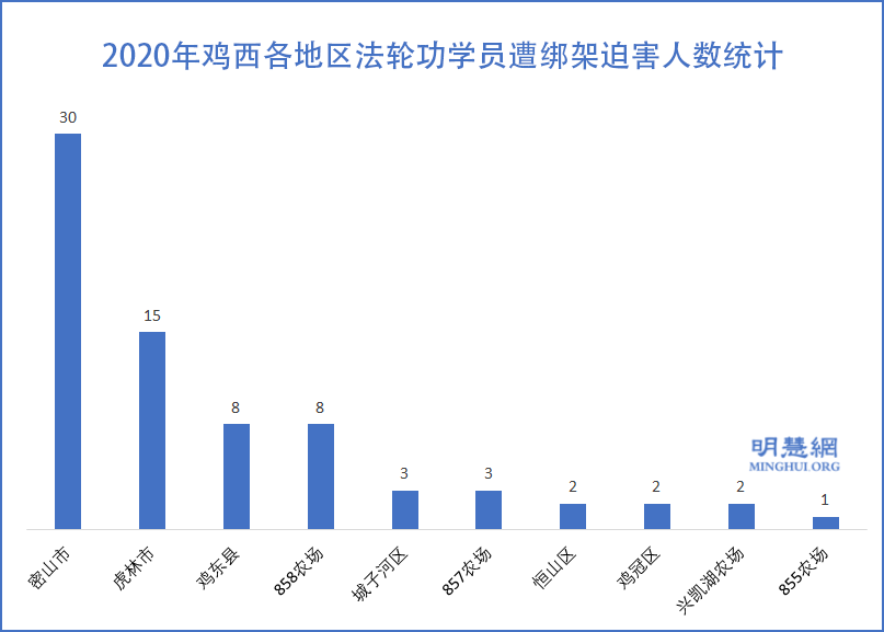 ![]() 图2:2020年鸡西各地区法轮功学员遭绑架迫害人数统计 |