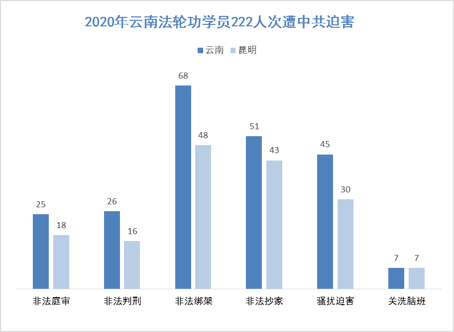 上图显示,二零二零年,云南有26名法轮功学员被非法判刑,68人次被绑架,51人次被非法抄家,骚扰45人次以上,有7人被送洗脑班,非法庭审20场、庭审25人。