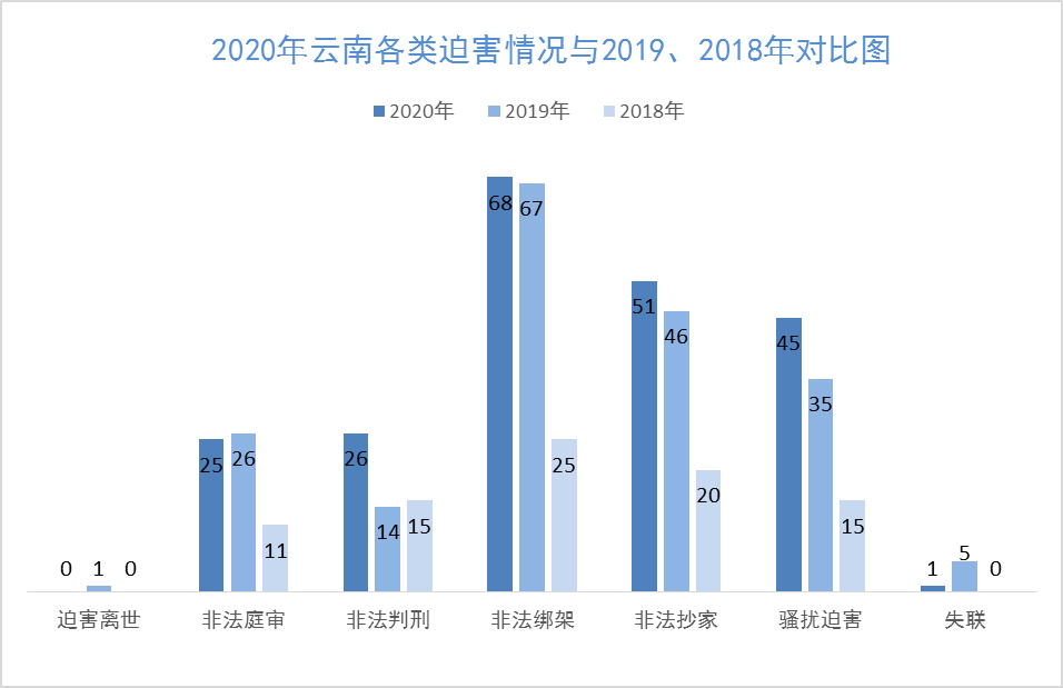 ![]() 图2:2020年云南各类迫害情况与2019、2018年对比图 |