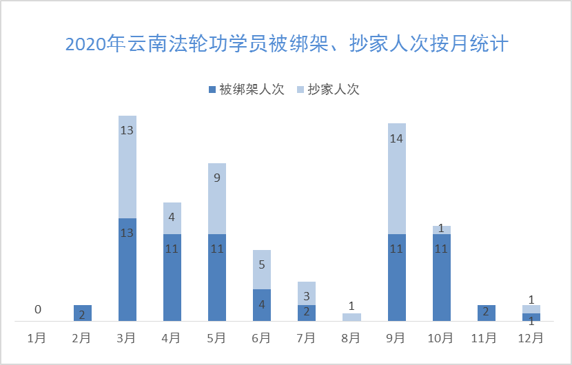 迫害形式主要以绑架、非法抄家和骚扰为主,迫害地区主要集中在省会城市昆明。二零二零年全省共有68人次遭绑架,昆明占了48人次。还出现了一人被多次绑架的情况,被绑架的均是70岁高龄以上的老年法轮功学员,昆明市81岁高琼仙老太、74岁童先珍老太都被绑架三次。昆明东川区张兴玉老人一家十口人被同时绑架,最小的才2岁。此外,去年全省非法抄家51次,昆明占了43人次,昆明市西山区海口镇仅9月份就对辖区内多位法轮功学员抄家,有的法轮功学员被抄家多次。