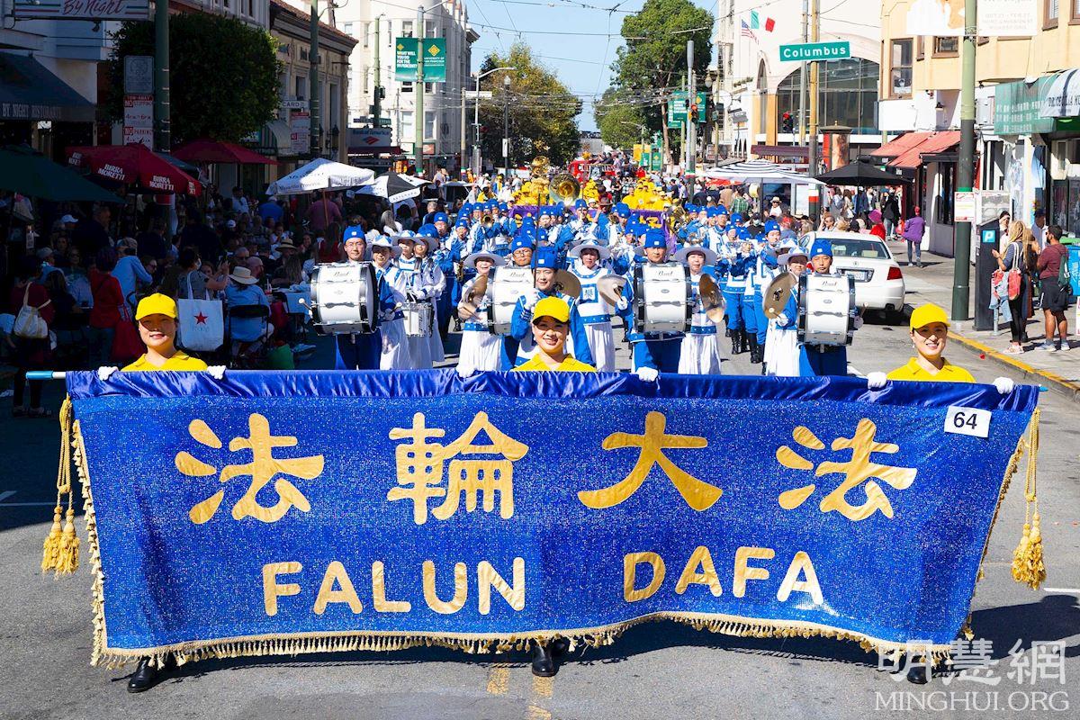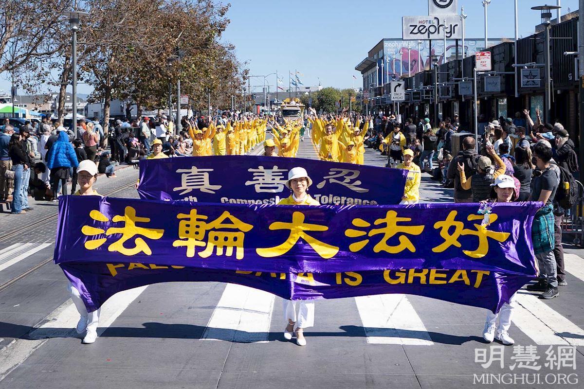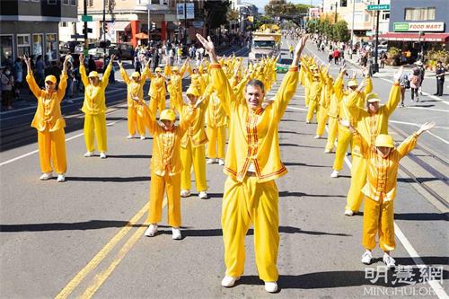 法轮功学员的队伍经过主席台时,主持人特蕾西·米克曼(Tracy Meekman)向观众介绍说,法轮大法的原则是真、善、忍,法轮大法是改善身心健康的修炼。法轮功学员的炼功队成员,身穿传统中国服装,演示法轮功功法。