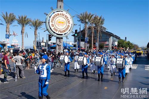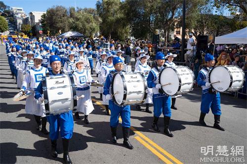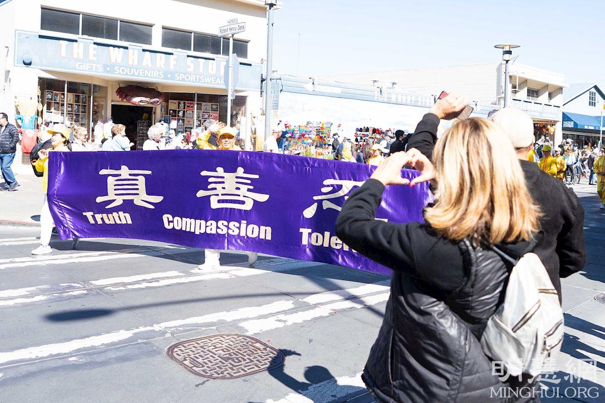 参加游行的法轮功学员的队伍有美西天国乐团、炼功队和首次亮相的造型优美的新花车。他们所到之处受到观众的喜爱。观众们有的向法轮功学员的队伍挥手致意,有的鼓掌拍照,有的跟着法轮功学员的动作比划着,还有的随着天国乐团的音乐跳起舞来。