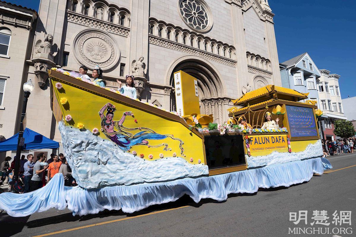 另一位主持人乔·莱沃尼(Joe Leveroni)说,“法轮功学员的花车非常漂亮,真的令人惊叹。这是法轮功学员的法船。法轮功学员炼功打坐,改善身心健康,让我们鼓掌欢迎他们。”