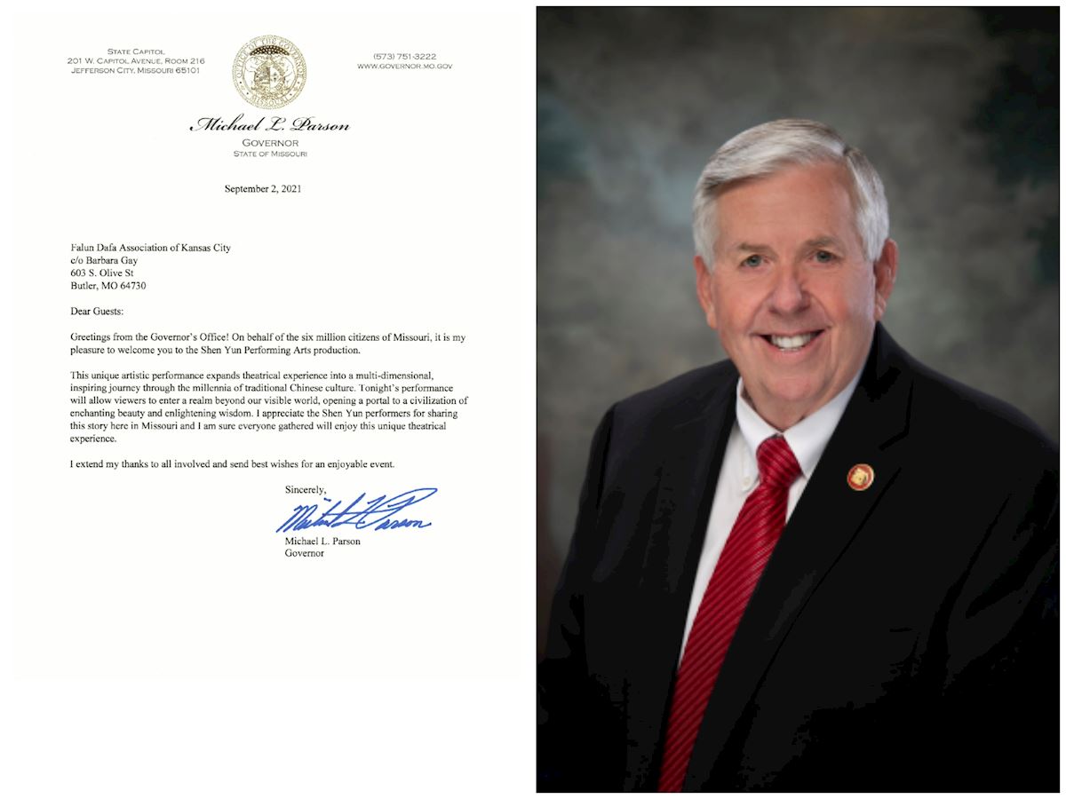 ![]() 图2:密苏里州州长迈克尔·L·帕森(Michael L. Parson)发贺信,祝愿神韵在堪萨斯的演出圆满成功。 |