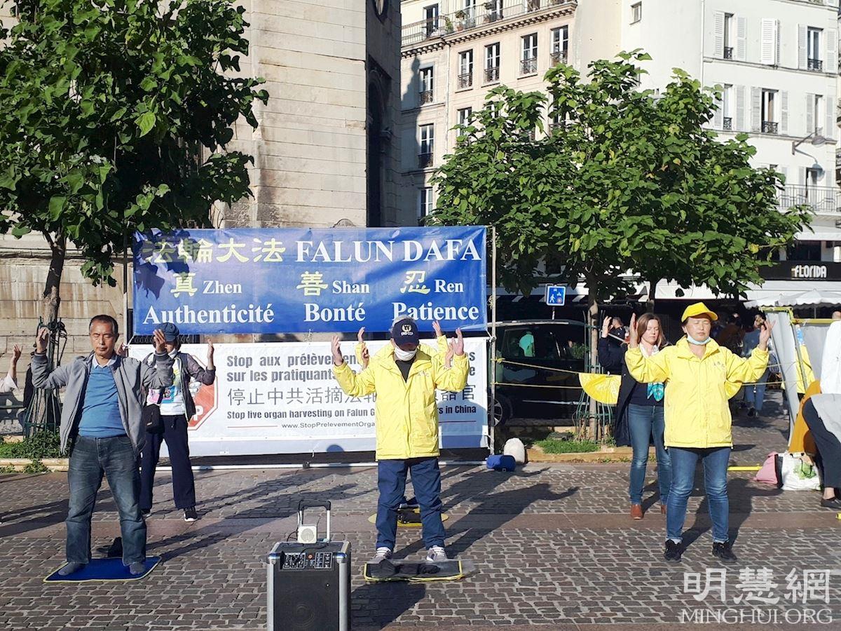 图7:二零二一年十月二日,法轮功学员在巴黎柯莱特广场演示法轮功功法。