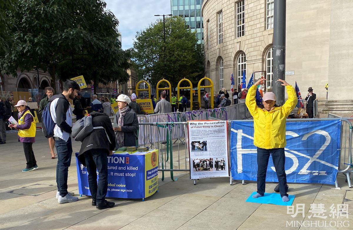 保守党的年会在曼城市中心的几天的活动中,法轮功学员打出横幅和展板,通过功法展示和发放传单向过往路人讲真相。 很多人在了解真相后,在征签板上签名支持。也有很多人表示对中共持续迫害法轮功学员感到震惊。