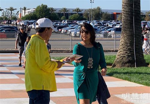一位四十多岁的中年女士说,她很高兴在这节日看到学员能在这里揭露中共的邪恶。她表示自己以前不关心社会上发生的事情,但是近期发生的事情,让她开始睁开眼睛,她看到了中共的邪恶和迫害法轮功等团体的残暴。她非常感谢学员为揭露迫害和弘扬法轮大法的真、善、忍所做的努力。她称赞法轮功这个群体不仅信神,而且能抵挡中共的迫害和邪恶。她鼓励学员继续做正在做的事情并帮助更多的人。