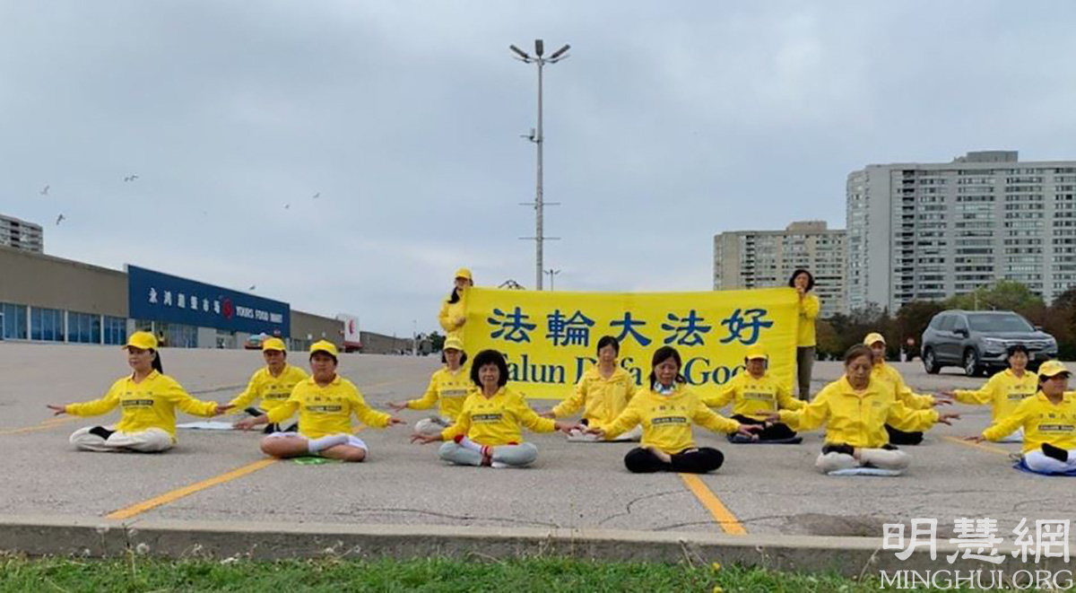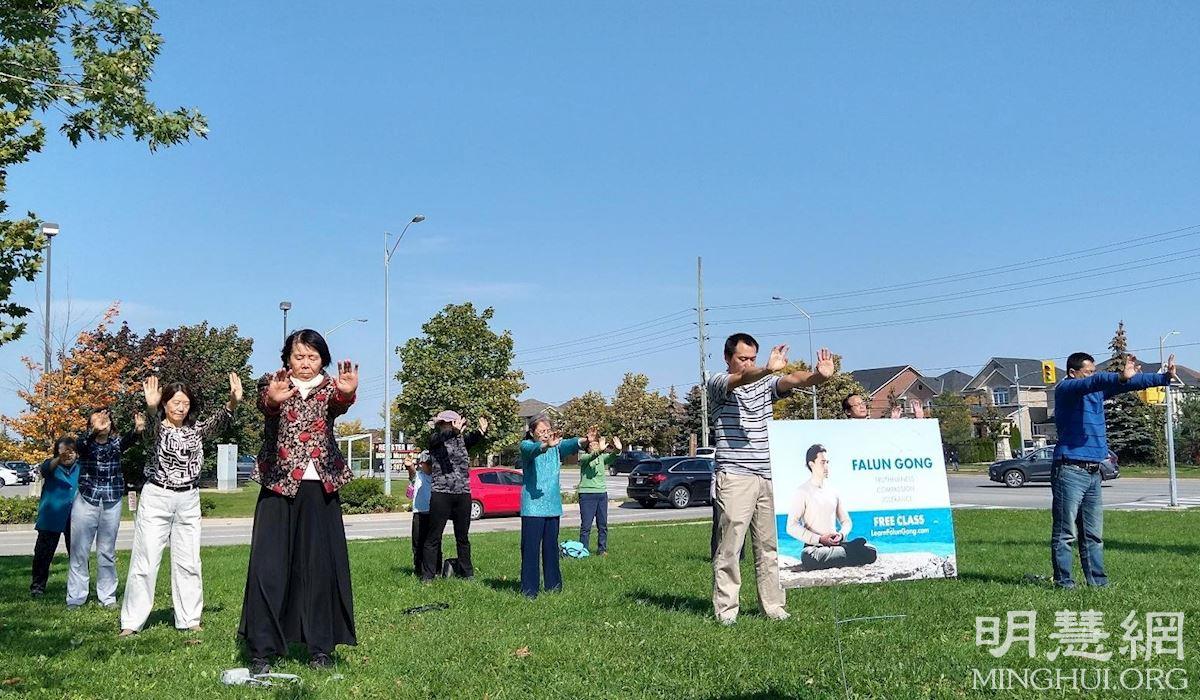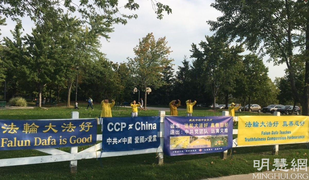 从多伦多赶到瀑布炼功点的学员把展板刚摆好,横幅还没挂起来,一位西人女士朱迪(Judy)就和她的两个朋友一起认真的阅读起资料来。她说她有在练瑜伽,但是思想总是静不下来。学员就对她说:“法轮大法是高德大法,不断的炼,不断的提高,你的心自然就能静下来。”她听的很认真,问什么时候开始,她很想学。当学员说随时都可以时,朱迪就说:“那我带我朋友去转转,等你们场地设置好就过来。”