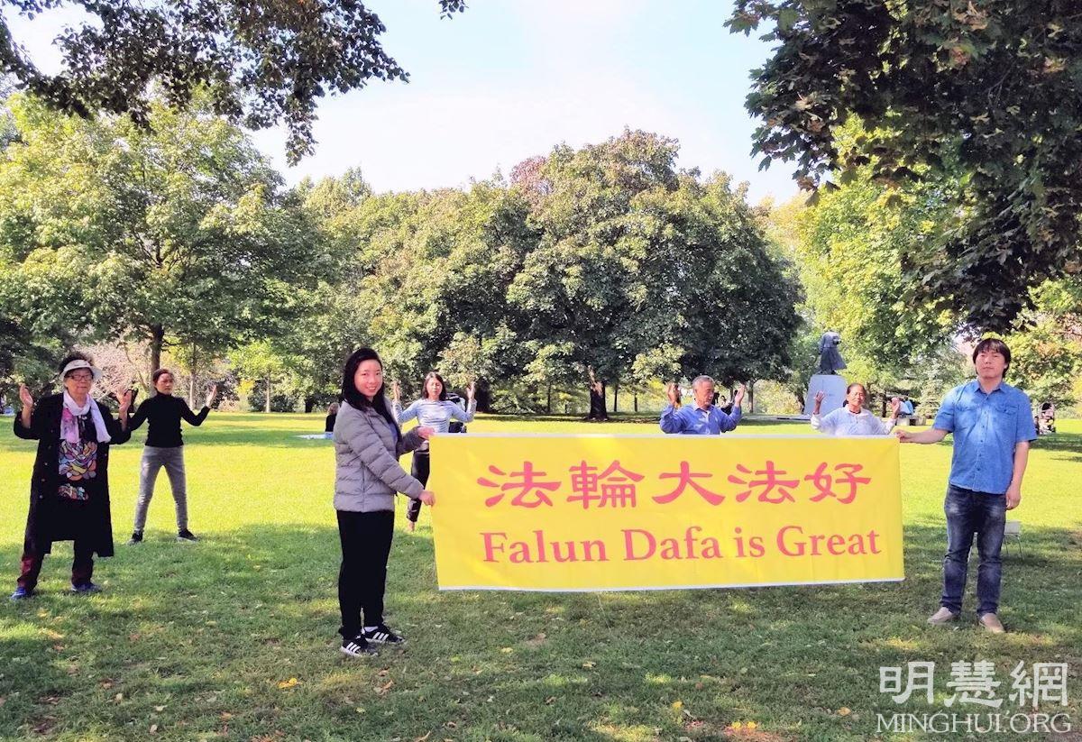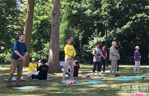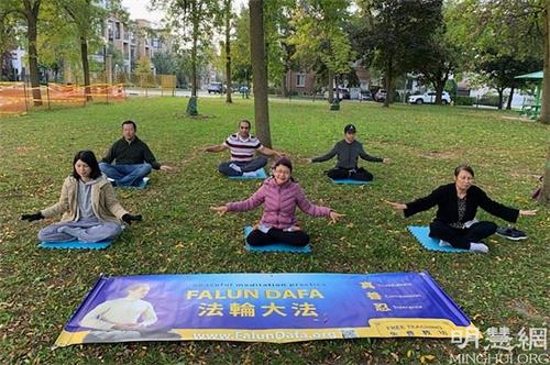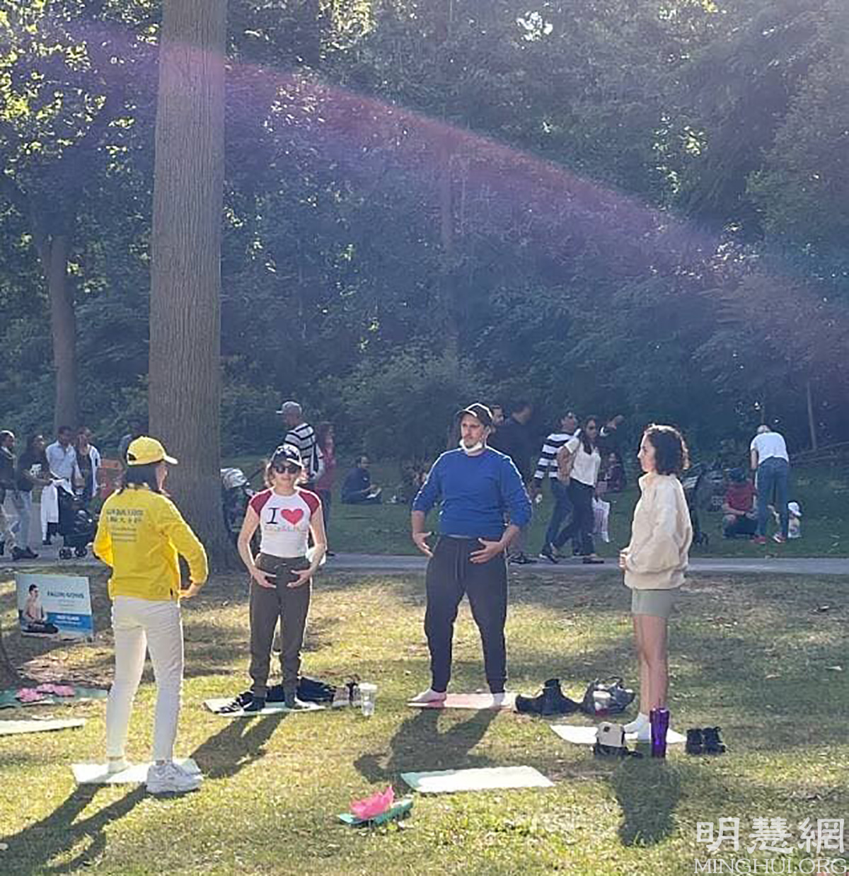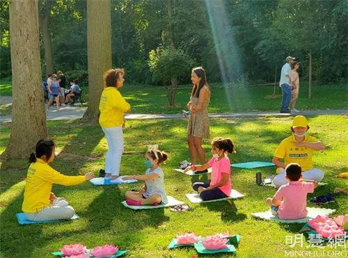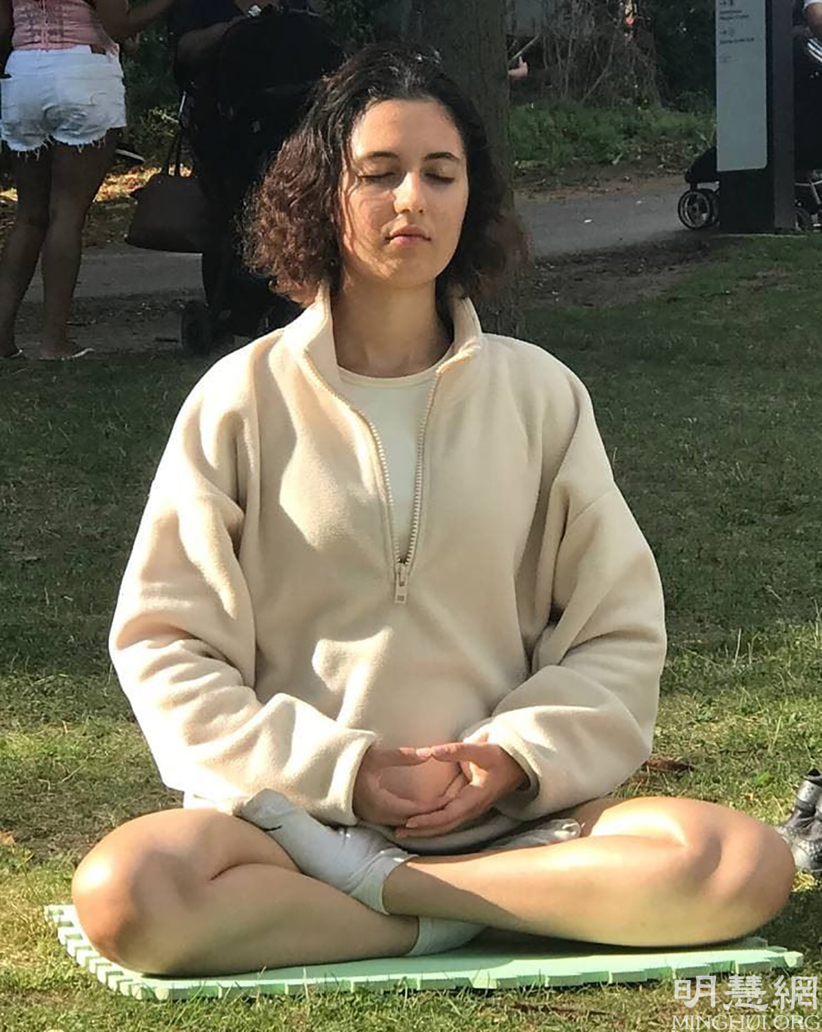 女孩再纳布(Zainab)本来是要到多伦多东区河谷公园(Riverdale Park)看日落,经过炼功点时,被学员打坐的场景吸引了。她接过传单阅读了一会儿,就说想学功法。