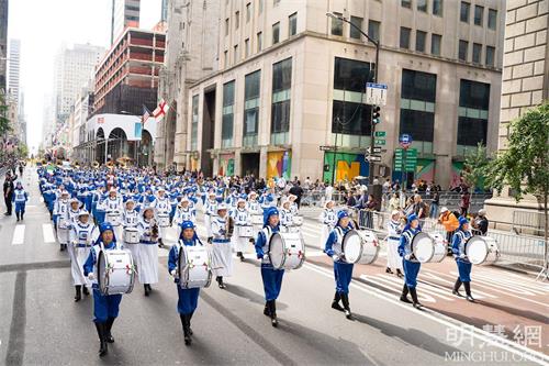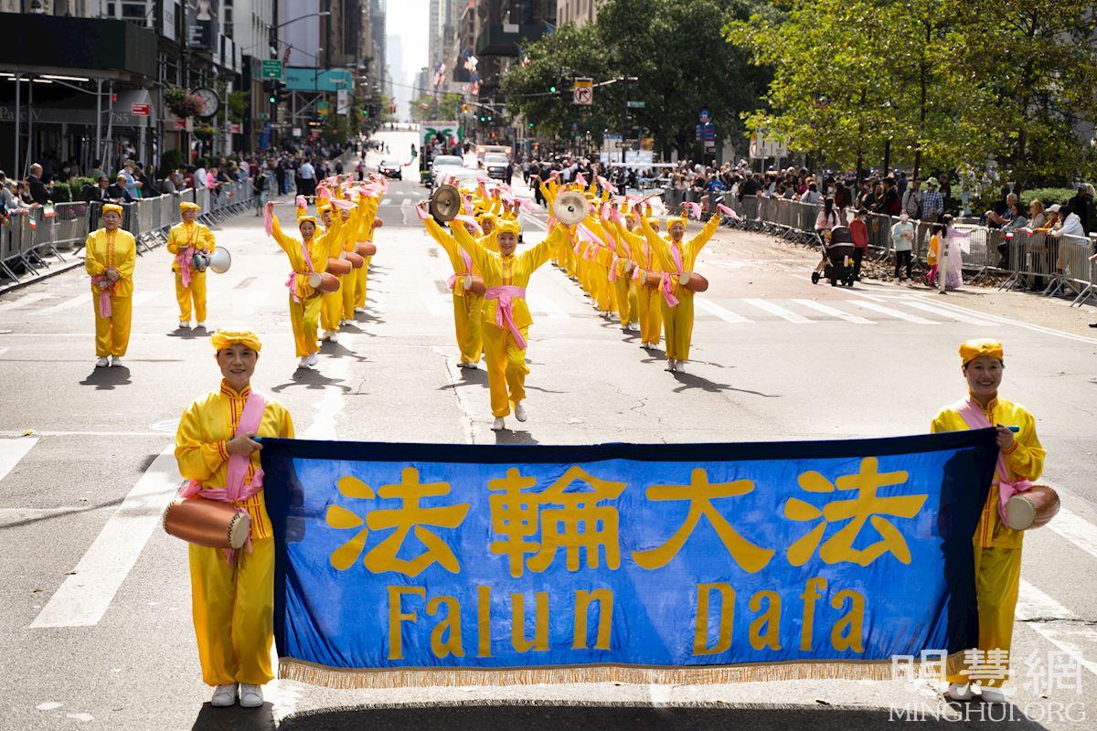 游行中,众人挥舞着意大利国旗,数十辆花车和乐队、上百个团体从第五大道上的四十四街游行到七十二街。法轮功学员的天国乐团、旗阵、法轮功功法展示与腰鼓队,在游行队伍中,非常亮眼。法轮功学员的演奏,鼓乐声声都传递着真、善、忍的信息,给观众留下深刻印象。观众纷纷表示法轮功队伍独特出众,非常棒,他们很喜欢。