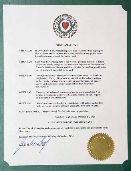 因此:我,市长约瑟夫‧M‧佩提在此宣布,二零二一年十月十六日和二零二一年十月十七日是伍斯特市的神韵艺术团日,并鼓励所有居民关注并参与观赏。