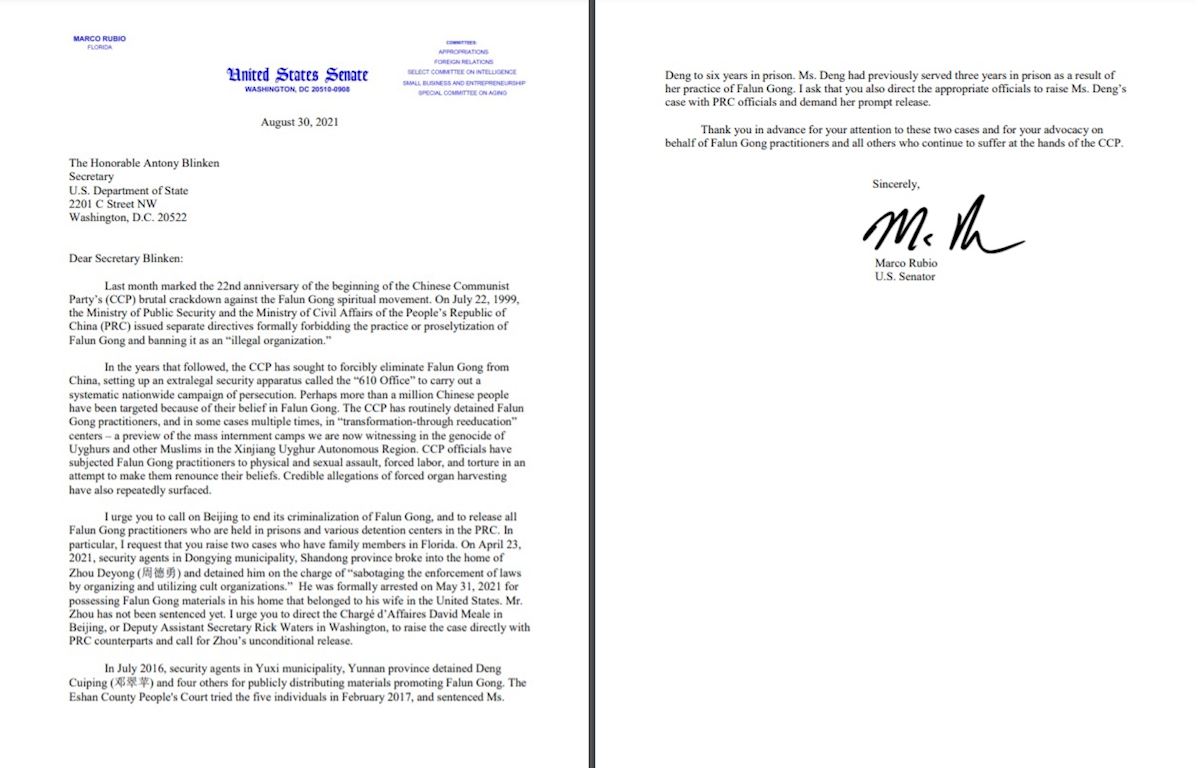 ![]() 图2:联邦参议员卢比奥(Senator Marco Rubio)致信国务卿布林肯(Antony Blinken),敦促国务卿呼吁中共释放所有法轮功学员。图为信件原文。 |