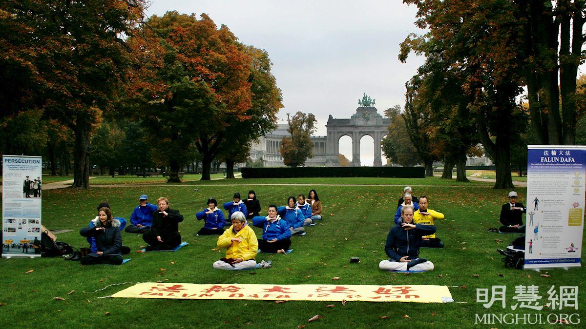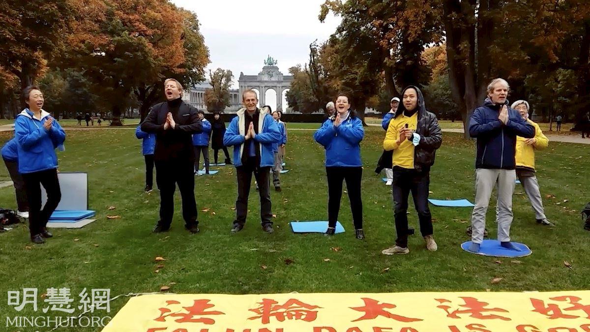布鲁塞尔五十年宫大公园是法轮功学员每周户外炼功点。这天,“国际捍卫自由与权利联盟”成员、人权倡导者安迪·维莫来到学员中间学习法轮功功法,与学员一起炼功一个半小时。最后他提议请全体人员一起呼喊“法轮大法好”,他深感法轮功带给炼功者平静的心态,和真、善、忍指导下能够使道德回升的社会效应。