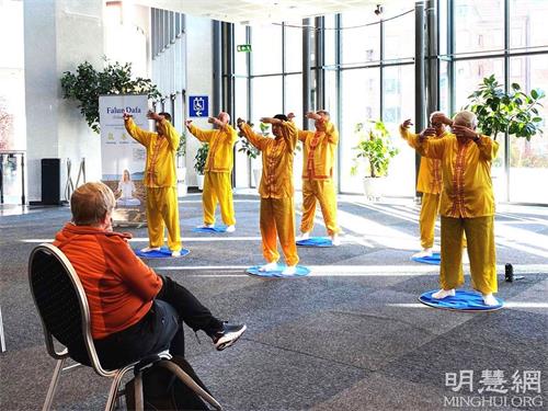 期间每天下午,悠扬的法轮功音乐在H大厅响起。哥德堡法轮功学员应邀在这里展示法轮功的五套功法,吸引了很多人观看。人们感受到了祥和美妙的能量场,久久不愿离开。每天都来观看功法展示的一位女作家表示,邂逅并了解了法轮功是参加本届书展的最大收获。