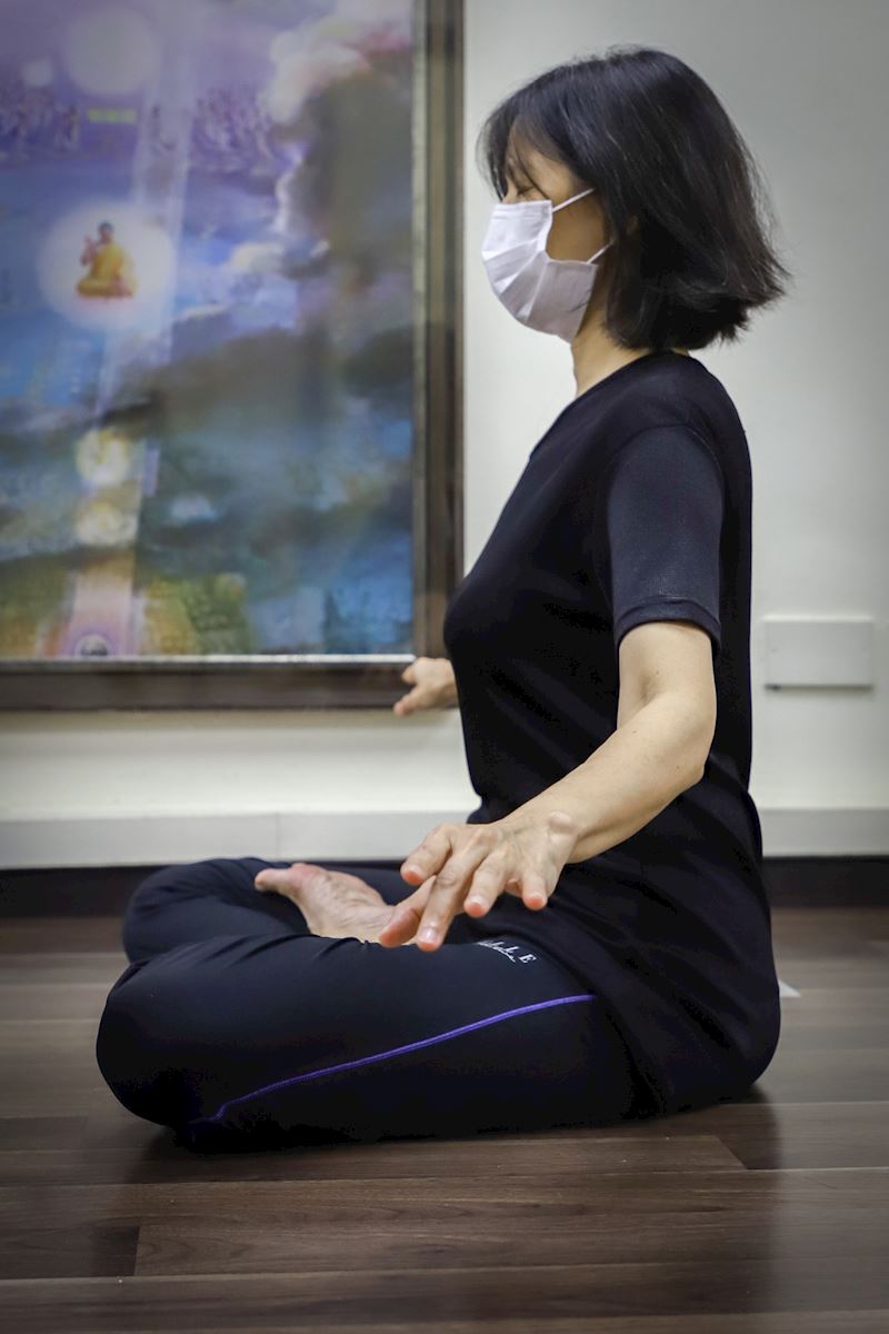 ![]() 图2:一位新学员在学炼第五套功法——打坐。 |