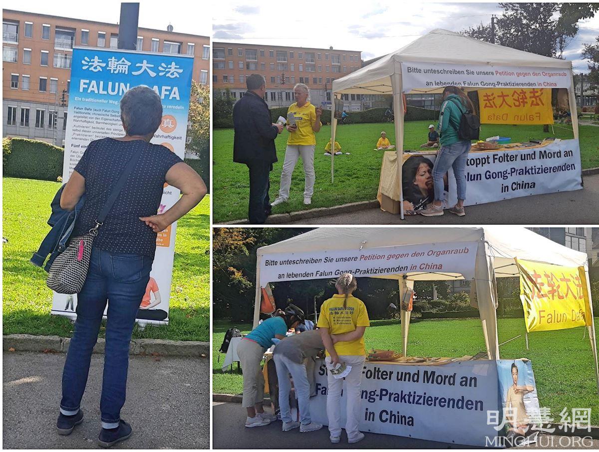 十月三日,在德国最南部的大学城康士坦茨(Konstanz),一位女士看到法轮功学员的真相横幅和展板,驻足向法轮功学员了解更多的讯息。她说:“我看到了关于活摘器官的内容,这让我非常伤心,我希望能了解更多的讯息。”