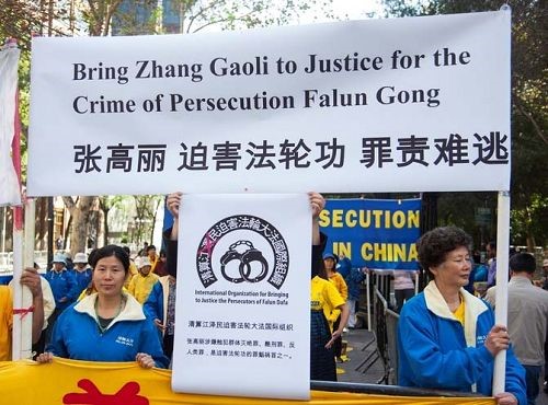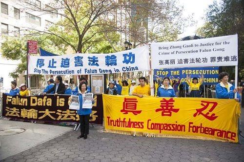 ![]() 2014年9月23日联合国气候峰会在纽约联合国总部开幕,时任中央常委、国务院副总理的张高丽与会,法轮功学员到场抗议。 |