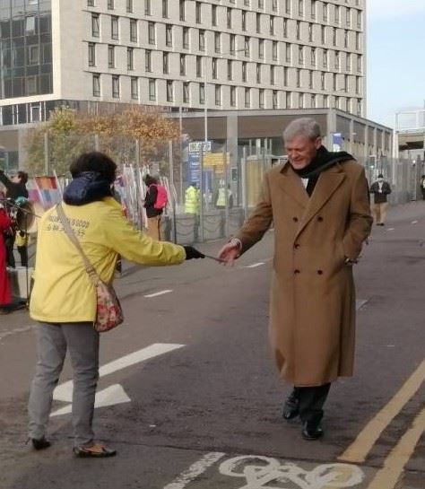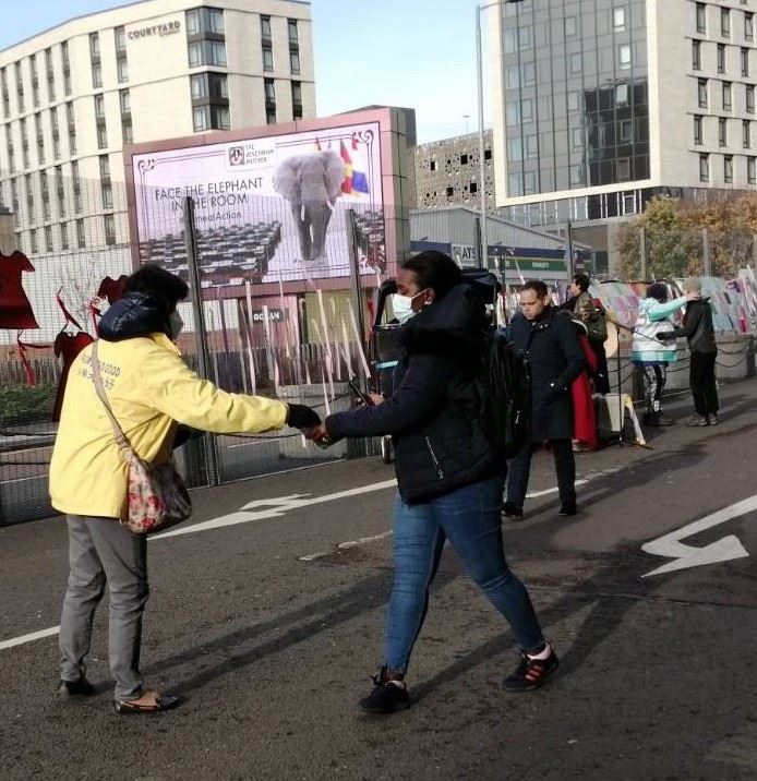 COP26期间,法轮功学员除了在会议中心举办讲真相活动外,也在两场大型的民众游行集会上传递真相。