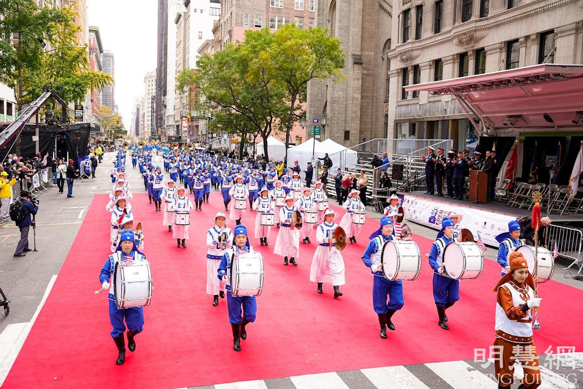 今年是法轮功团体第十七年参与老兵节游行,已成为这个年度大游行中一道独特的风景线。打头阵的天国乐团队伍一出现,两旁观众拍照的、欢呼的、鼓掌的、竖大拇指的、和应着节拍挥舞国旗的景象此起彼伏。民众脸上挂着灿烂的笑容,一名女子更激动得连说了十几句:“I love it!(我爱这个队伍)”并说:“太触动我的心了!” 气势雄壮的鼓乐响彻曼哈顿街头,除了《法轮大法好》、《神圣的歌》等曲目,他们特别为老兵节演奏美国著名的进行曲《星条旗永不落》,获得了主席台嘉宾们的热烈掌声。