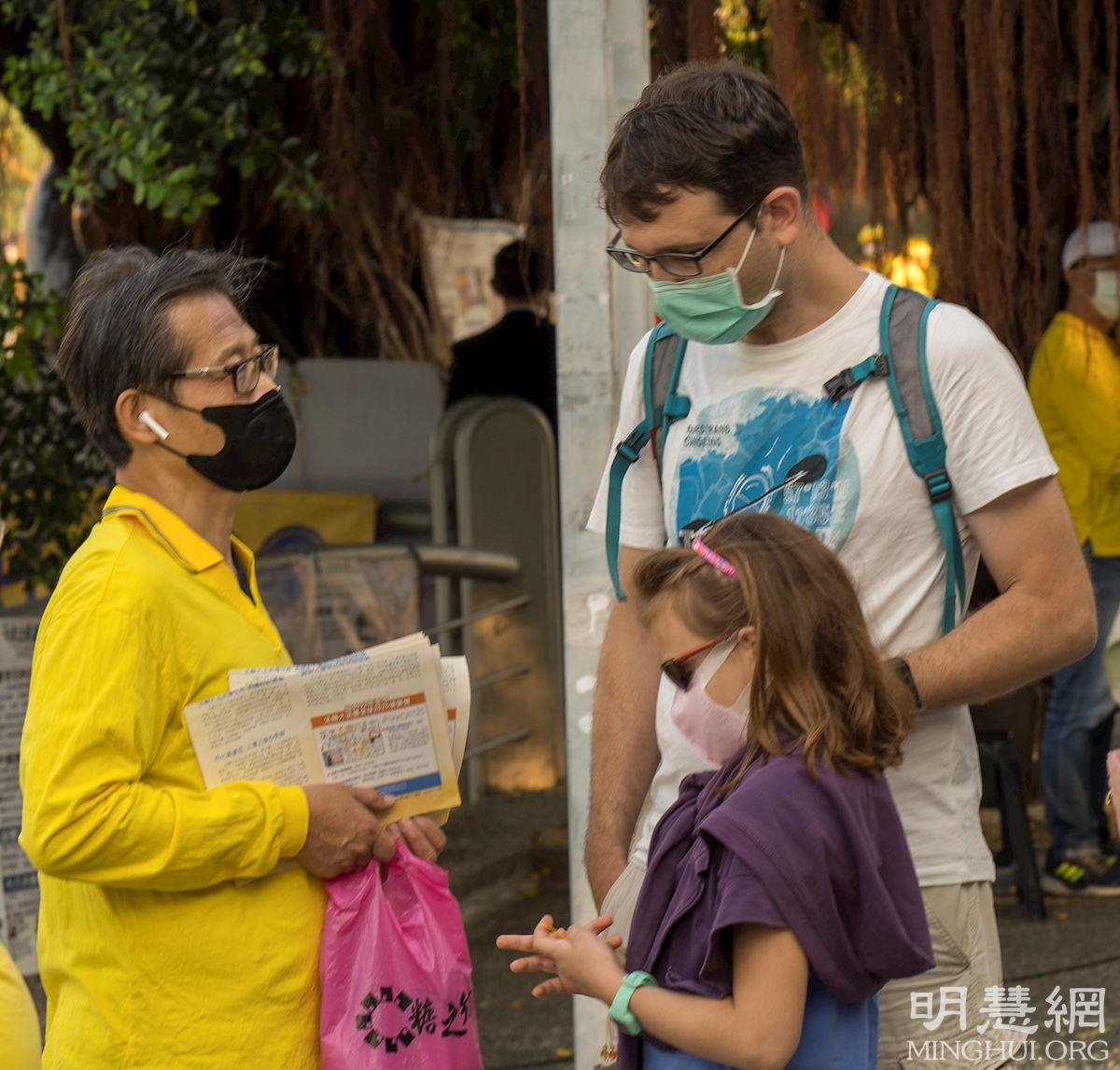 ![]() 图7:路过游客对法轮功颇有兴趣,其中一对西人父女游客特别向学员询问法轮功的学炼方式和炼功点。 |