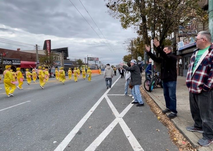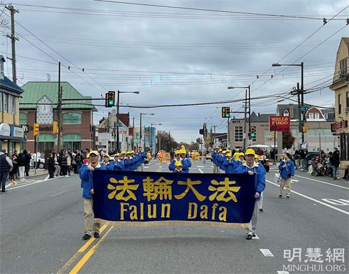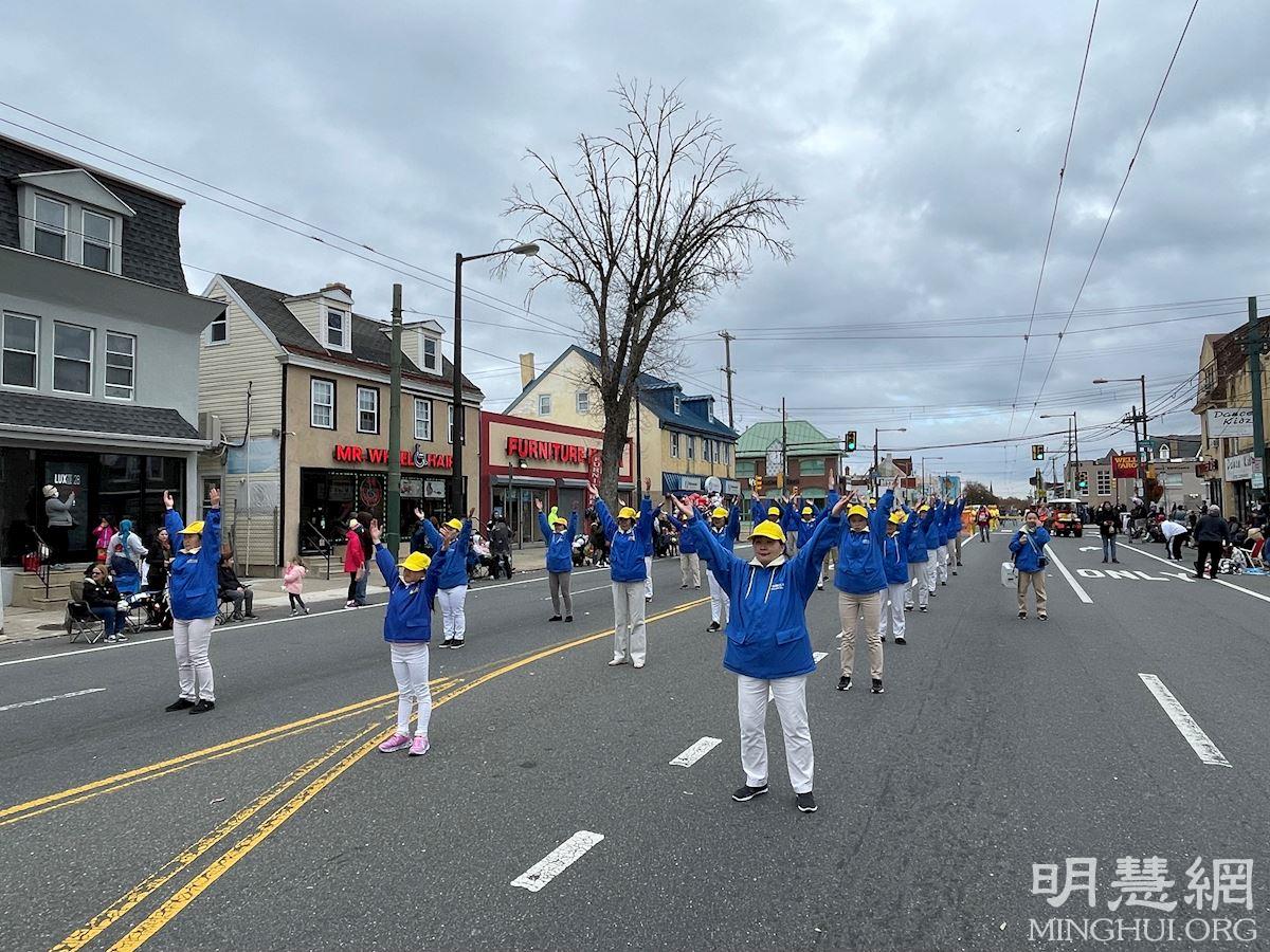 感恩节是美国最重要的传统节日之一,当天民众携家带口、搬出小凳子坐在路边翘首以待。游行沿着主要商业街法兰克福大道(Frankford Ave)进行,全程约1.5英里,共有约一百三十多个团体参加,由警察局的队伍打头阵,载着圣诞老人的消防车压阵,当地的学校、机构、社团、军队等依次亮相。法轮功学员是第一次参加这个游行。