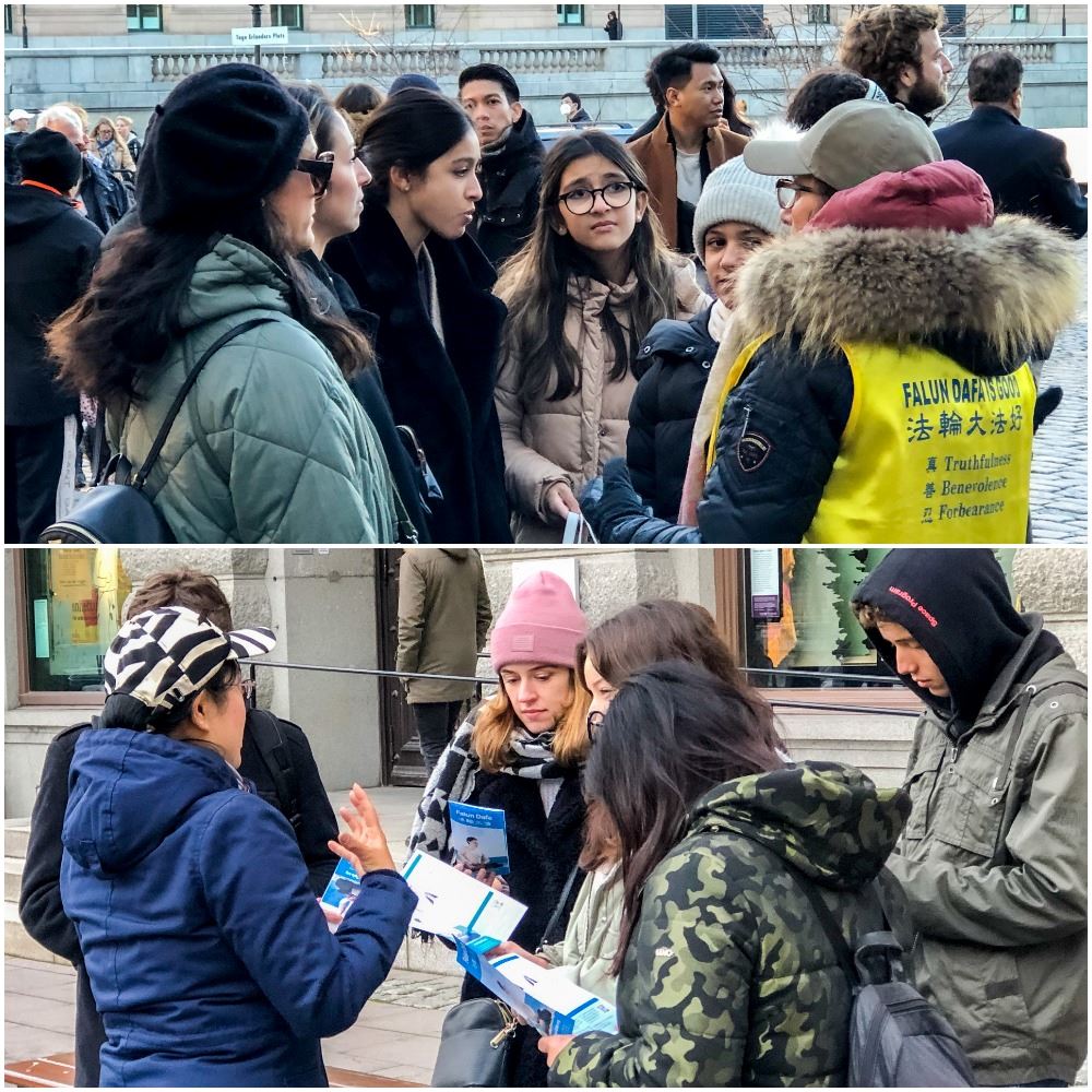 “从和你的谈话中,我感受到你们的真诚、善良,这里有一个非常非常美好、祥和的能量场,尽管广场上吵吵嚷嚷,但当人一站在这里就明显地感受到祥和。”这是十一月二十七日周六,斯德哥尔摩市民巴塞尔(Basel)在和学员交谈时的感叹。