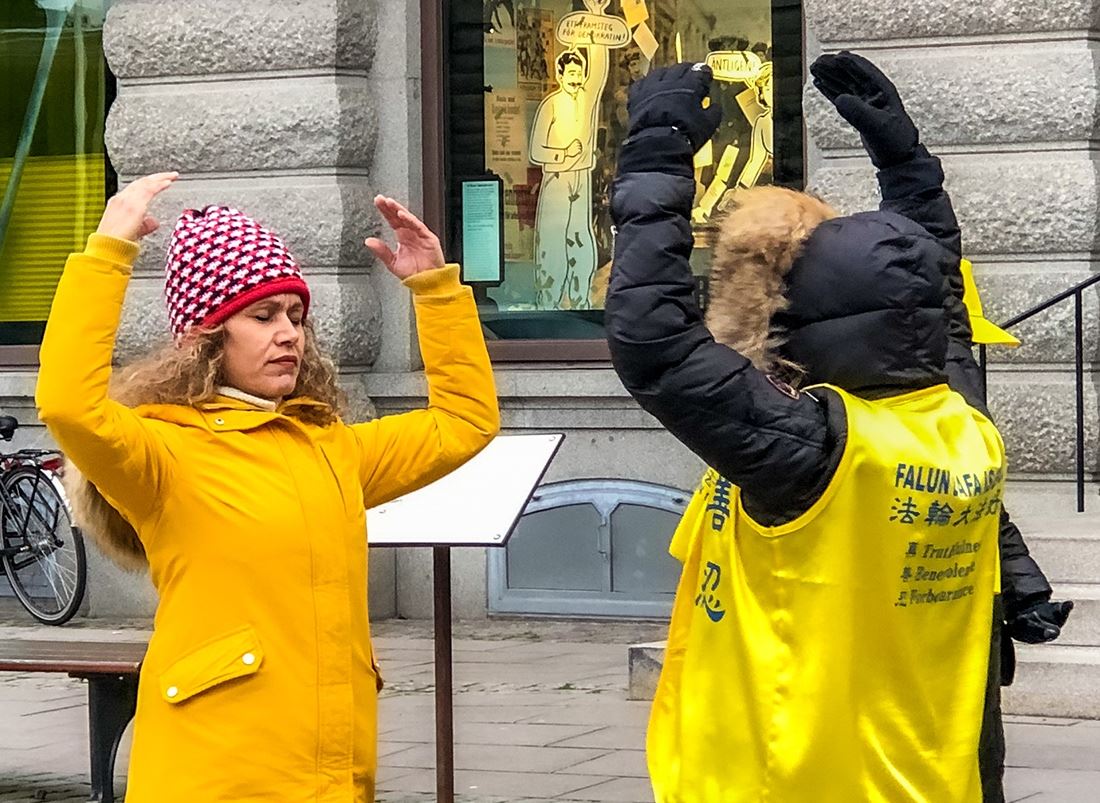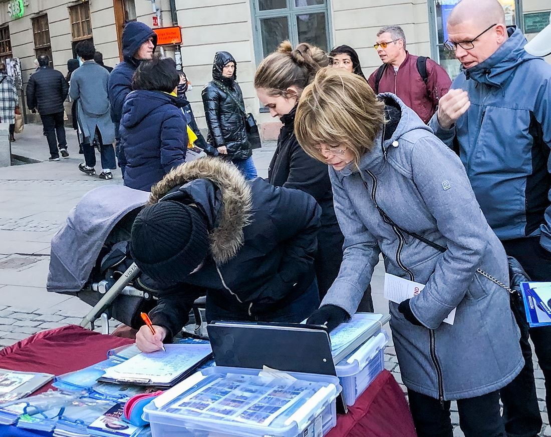 来自智利的女士辛西娅(Cynthia)和她的瑞典丈夫生活在瑞典的北部,当天在钱币广场邂逅法轮功,她和学员交谈了很久,并在征签表上签名。