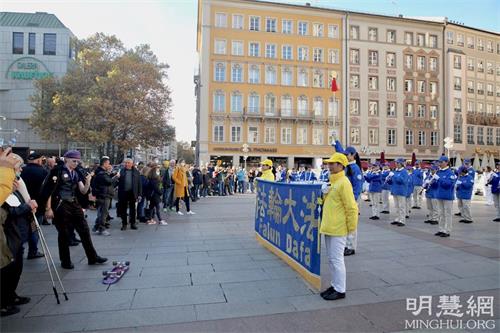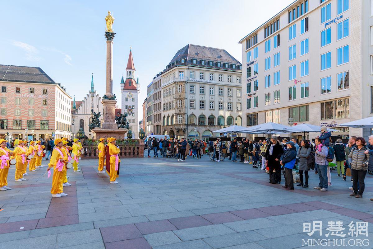 慕尼黑是德国巴伐利亚州的首府,德国第三大城市,也是德国文化、经济、政治和新闻中心。当天,慕尼黑内城挤满了人。在市政厅前的玛丽安广场(Marienplatz)上,“法轮大法好”、“真善忍”、“停止迫害法轮功”、“中共活摘法轮功学员器官”等大型横幅十分醒目。欧洲天国乐团、德国腰鼓队和来自波兰和捷克的舞龙队应邀参加了活动,他们的表演吸引了大量民众的目光。