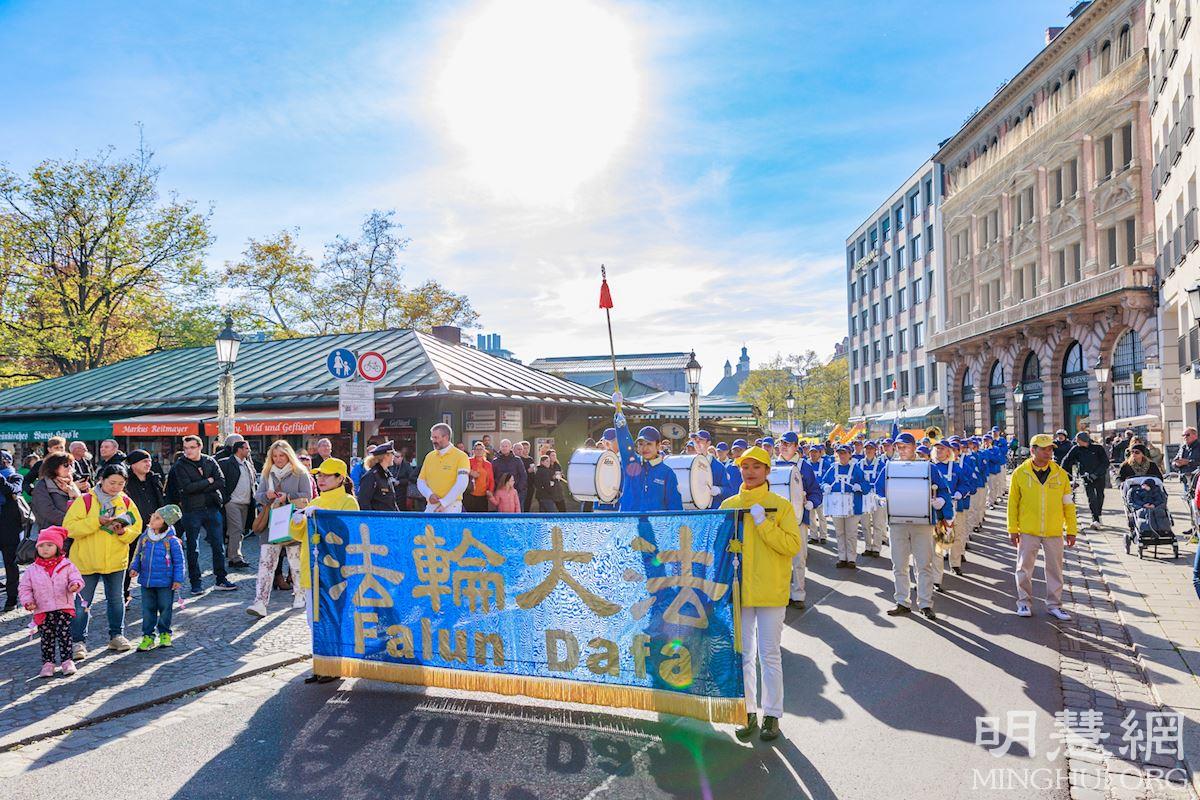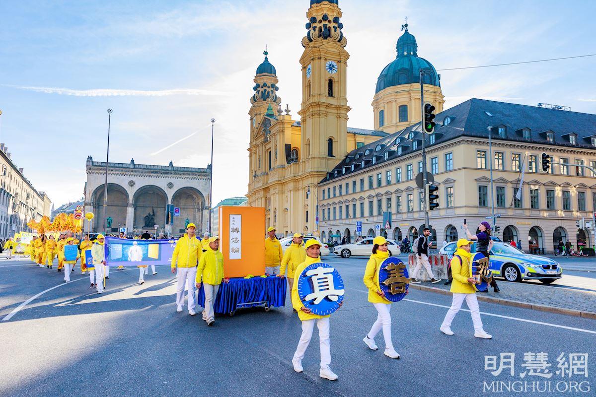 集会后,法轮功学员从玛丽亚广场出发,途经著名的谷物市场(Viktualienmarkt)、塔尔大街(Tal)、著名奢侈品街马克西米利安大街(Maximilianstraße)、国家剧院、慕尼黑王宫和奥迪安广场(Odeonsplatz),最后回到玛丽亚广场。所到之处,人们熙熙攘攘,大家竞相观看法轮功学员的游行队伍,有的人拿到资料马上仔细观看,有的人伸出大拇指,沿途很多人签名声援法轮功学员反迫害。