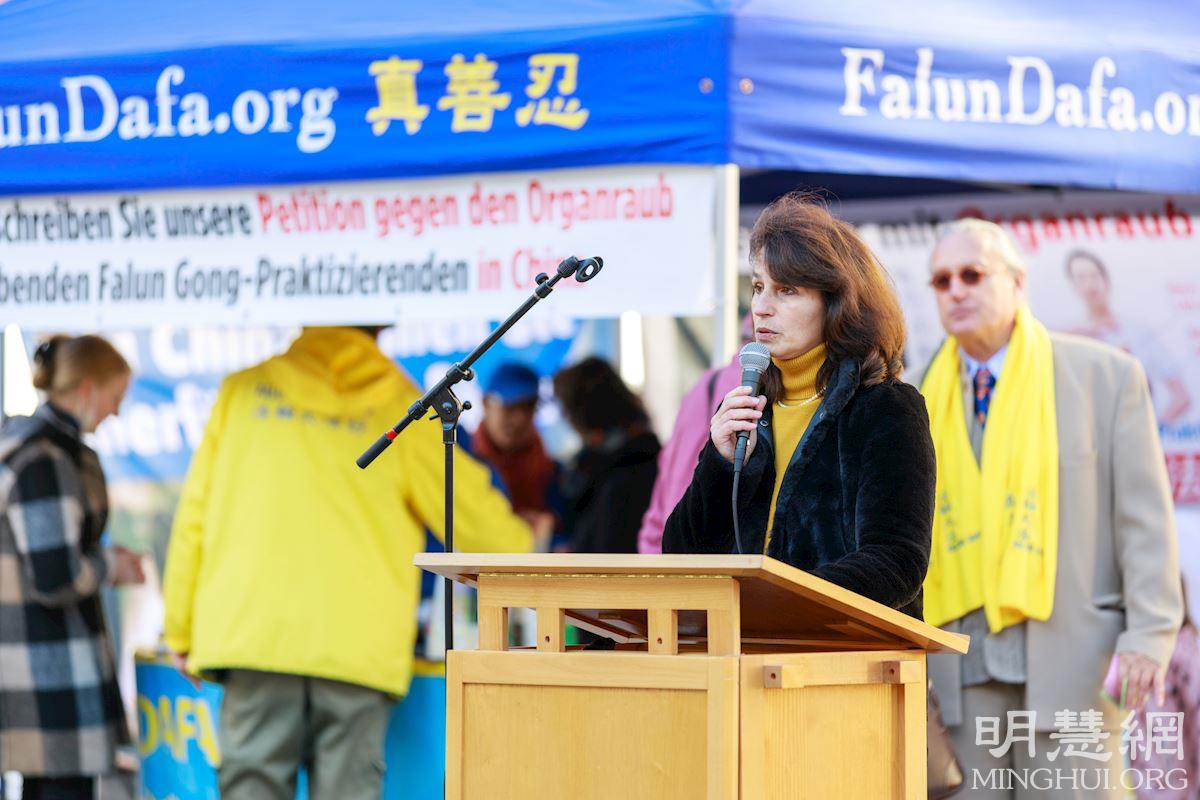 德国国际人权组织慕尼黑负责人缇拉克先生(Jürgen Thierack)到场声援并发言。他表示,德国国际人权组织多年来关注中共对法轮功的迫害。他向在场民众介绍说,法轮功又叫法轮大法,是一种打坐运动,由李洪志先生创建,一九九二年传出后在中国广为传播,并得到国家认可和赞赏。一九九九年江泽民把法轮功当成国家的敌人,进行经济和肉体灭绝。