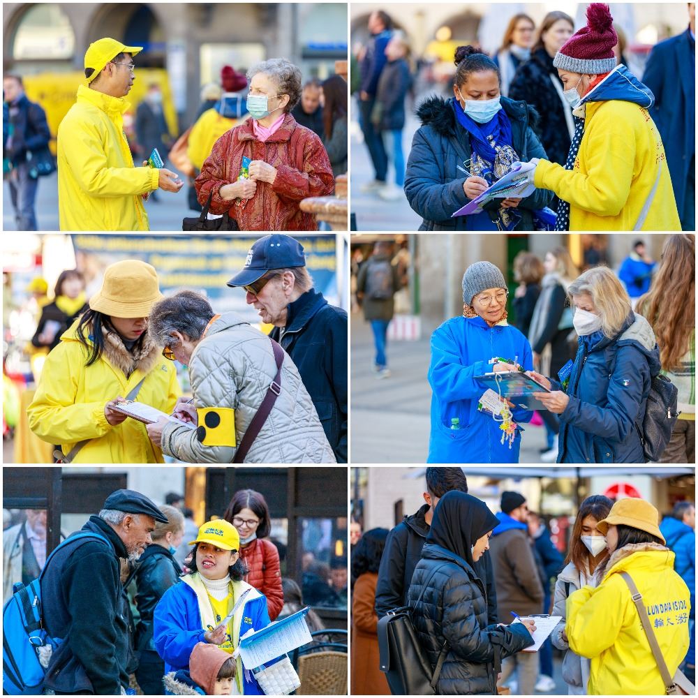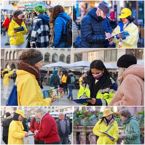 偶尔从附近城市到慕尼黑来的教育工作者迪尔夫妇(Niklauda 和 Werner Dill)观看并录下了法轮功学员的游行队伍,觉得“非常美妙与平和”,他们在玛利亚广场签名制止中共活摘法轮功学员器官,“我听说过中国盗取器官的丑闻,令人无法承受。”迪尔太太说,“他们(中共)对待人的方式远离人性,不能这样下去了。”