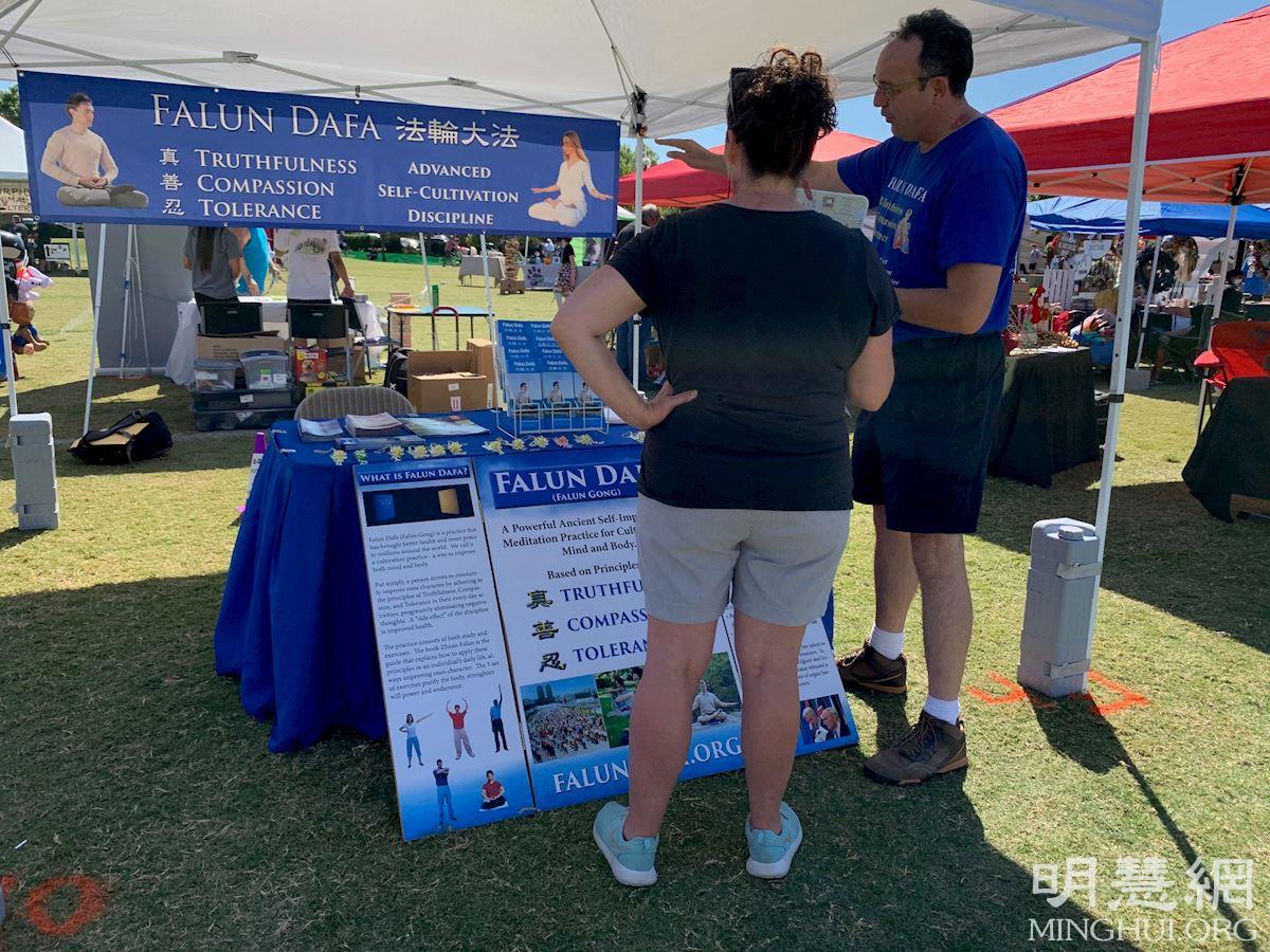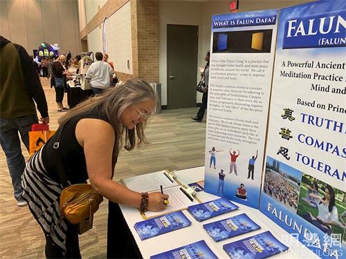 凯特(Kate)女士是一家通讯公司的电子工程师,她看到法轮功学员的展位感到惊喜,因为她一直喜欢打坐,她说因疫情的关系她一直在家上班,就在想要学一种功法,提升自己的精神。她认真地听了法轮功学员的介绍后,认为法轮功对人的身体健康的益处和对人思想境界的提高正是自己要寻到的,让她很倾心,一定会学。