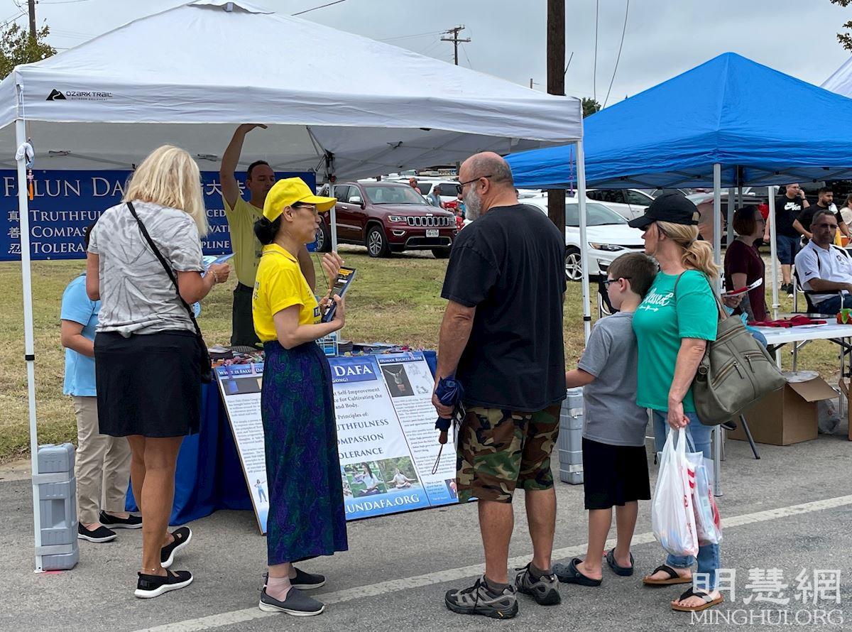 ![]() 图1:一位法轮功学员正在向前来问询的女士介绍法轮功 |