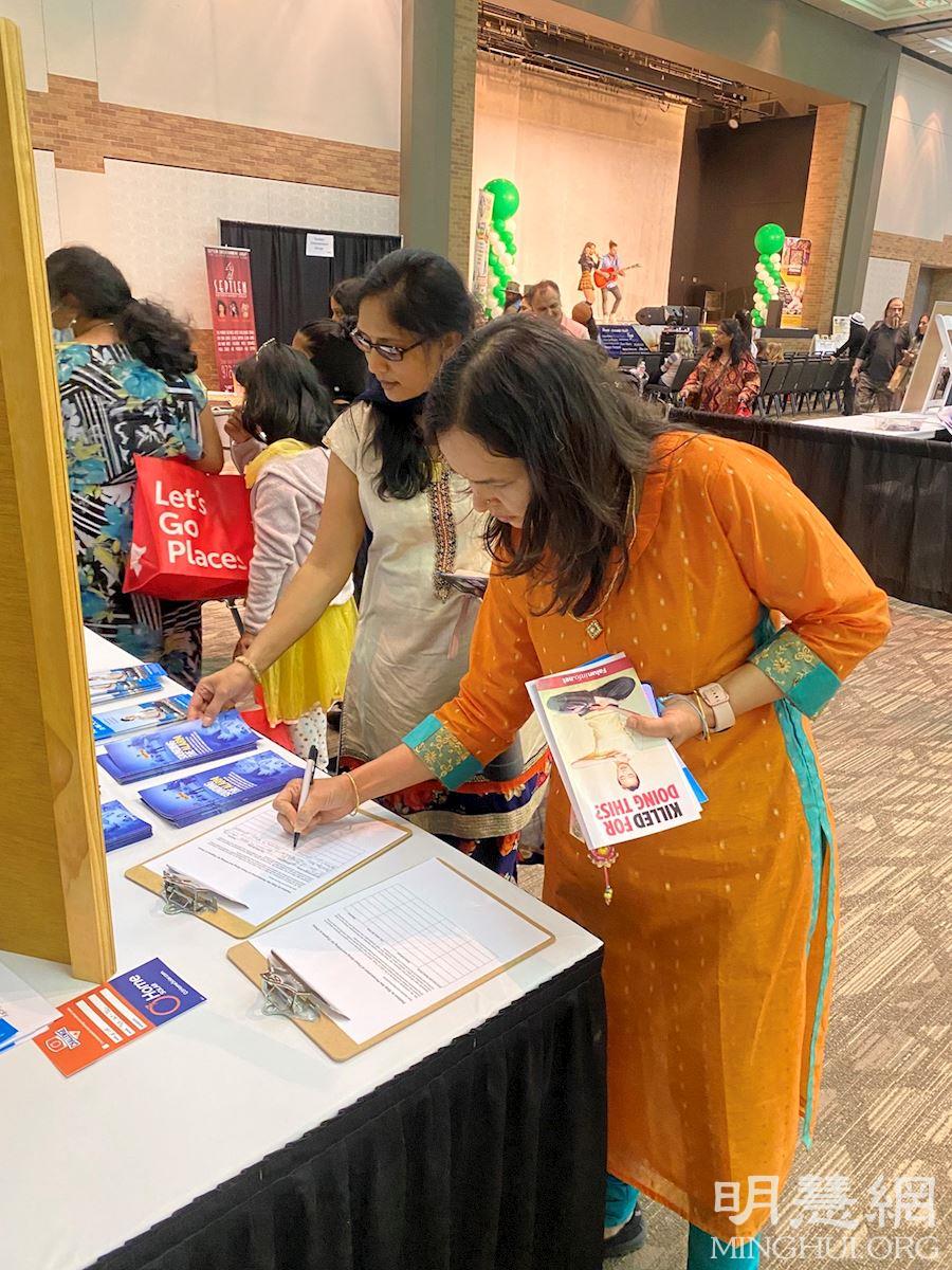 法轮功在中共大陆遭受迫害的信息使人们很震惊,表示一个政府对一群善良民众的残酷迫害让人无法理解,应该制止,许多人在展位前签字要求中共停止迫害。