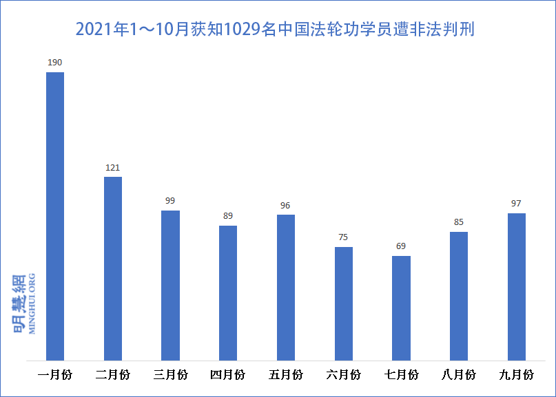 二零二一年一月至十月有1029名法轮功学员被非法判刑。其中。一月份190人,二月份121人,三月份99人,四月份89人,五月份96人,六月份75人,七月份69人,八月份85人,九月份97人,十月份108人。