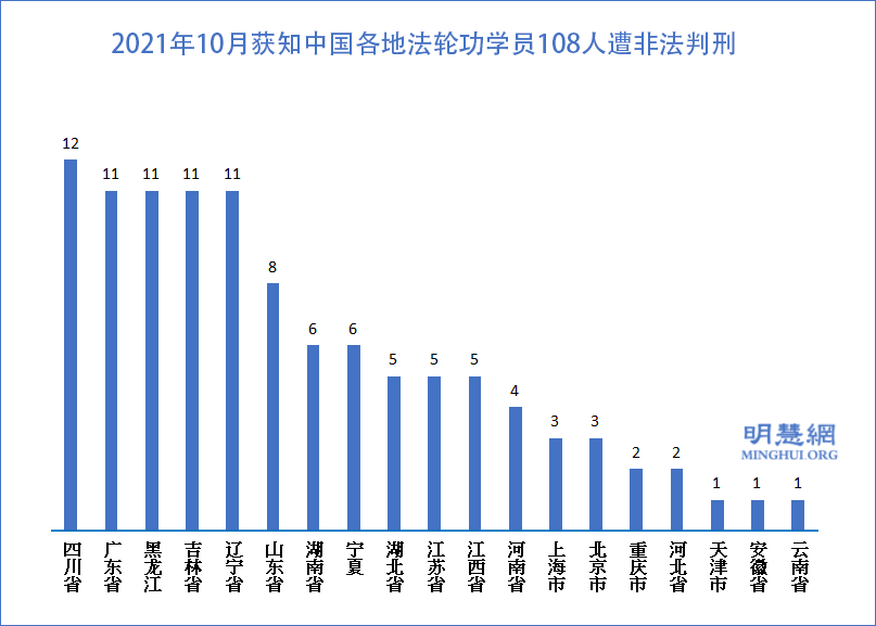 ![]() 图3:2021年10月获知中国各地法轮功学员108人遭非法判刑 |