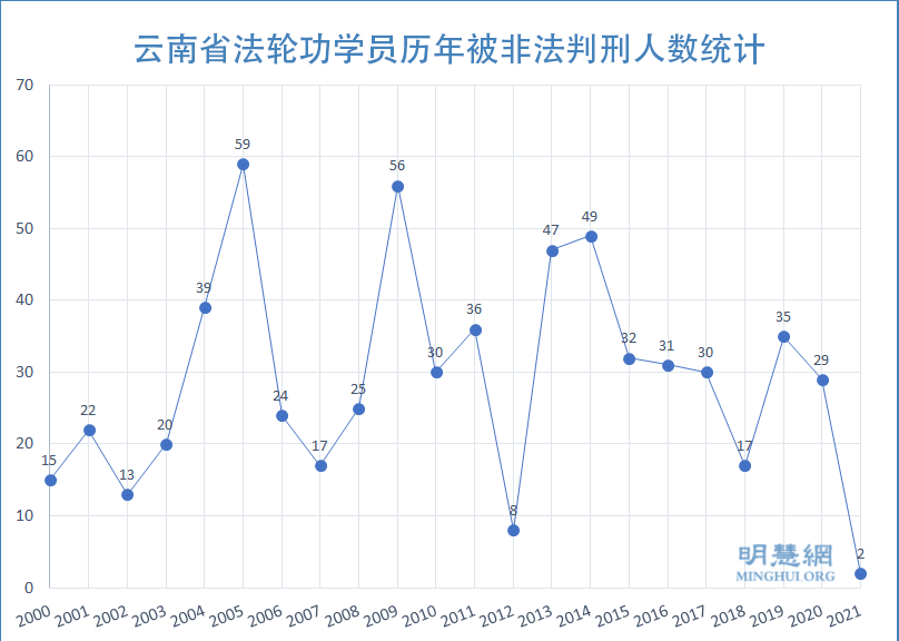 迫害开始初期,即二零零三年之前,迫害以强迫洗脑或送劳教为主要迫害手段,根据明慧网资料显示,二零零零年,云南被非法劳教的法轮功学员高达118名。二零一二年非法的劳教制度取消后,迫害以非法判刑为主。