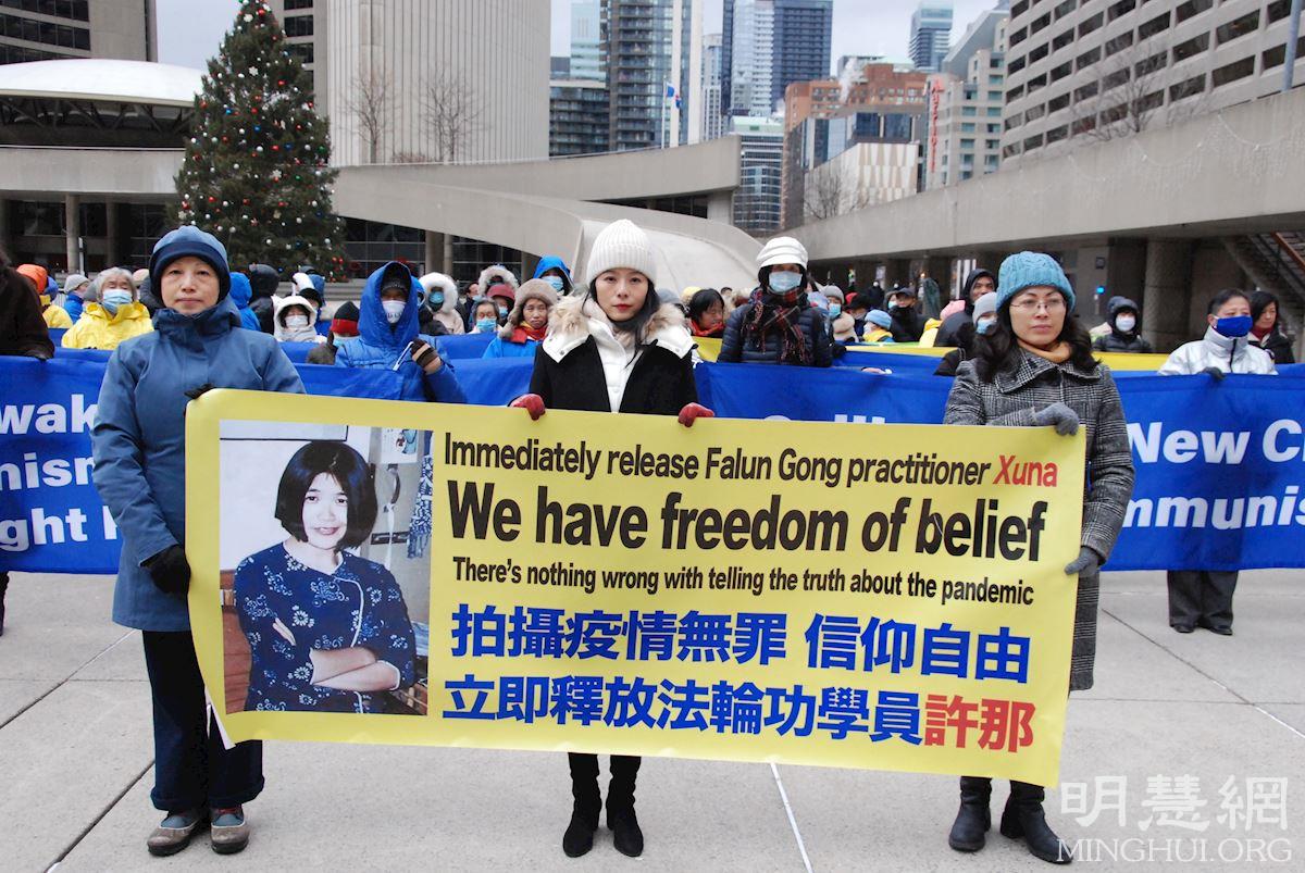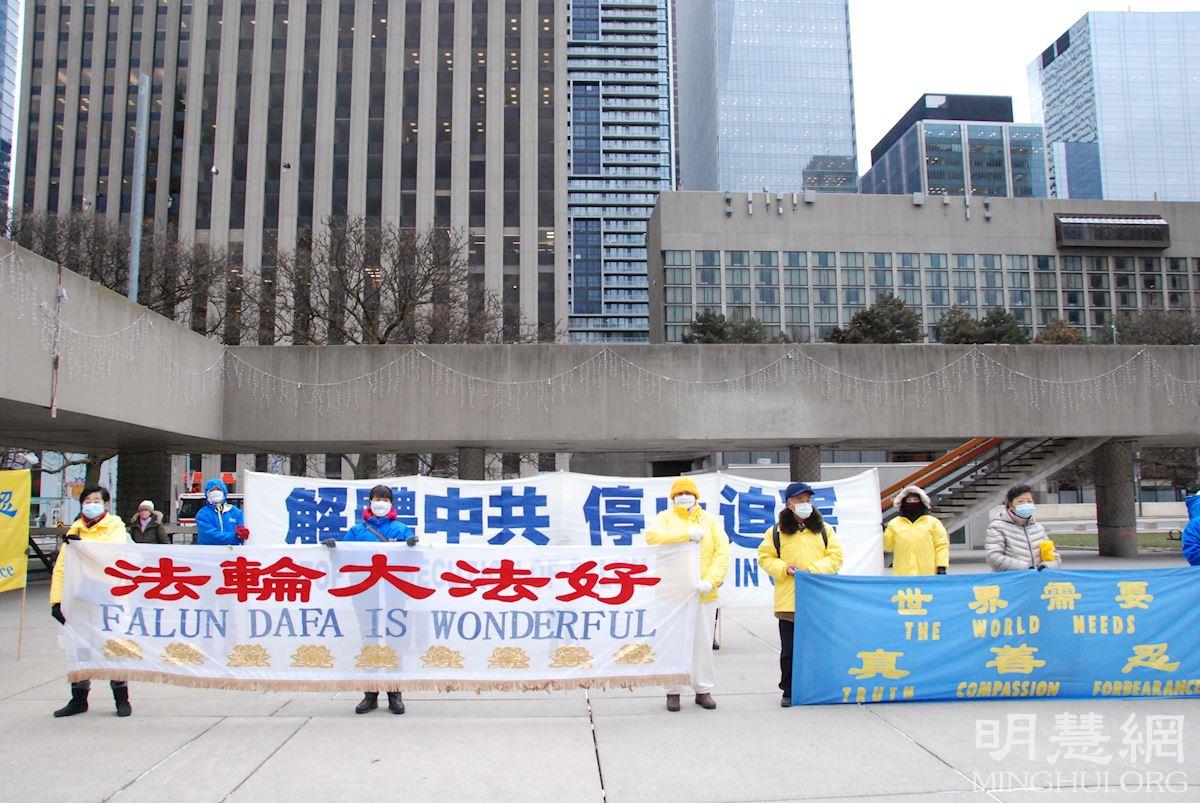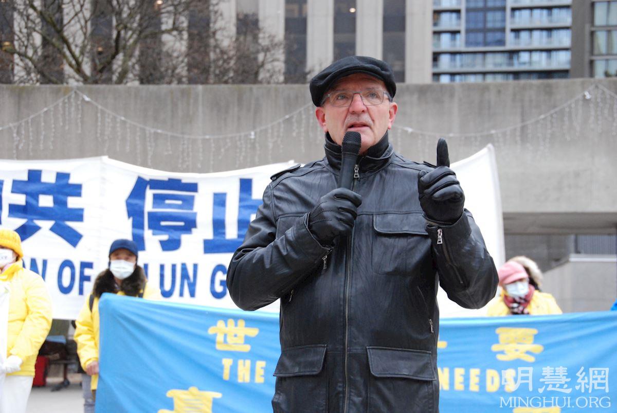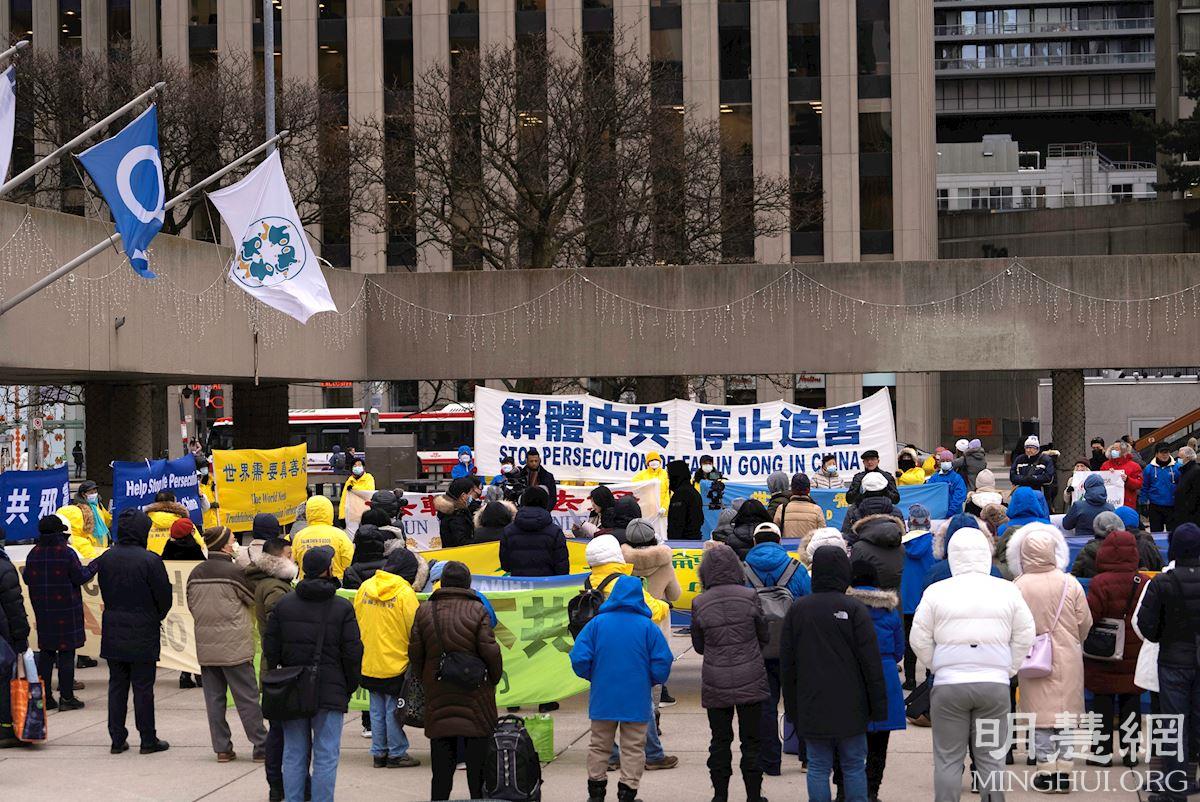【明慧网二零二一年十二月十日】(明慧多伦多记者站报道)十二月十日是国际人权日。二零二一年十二月七日,加拿大多伦多法轮功学员在市政厅广场举行集会,呼吁加拿大政府在出席全球民主峰会期间,要求中共停止对法轮功学员长达二十二年的迫害、立即释放加拿大公民在中国大陆被非法关押的亲人。多名加拿大政要到场发言,声援营救在中国被非法关押的法轮功学员。包括加拿大前参议员迪尼诺(Consiglio Di Nino),加拿大前国会议员莱蒂斯劳·李赞(Wladyslaw Lizon),加拿大台湾人权协会会长麦克·史(Michael Station)和民阵全球副主席盛雪。
