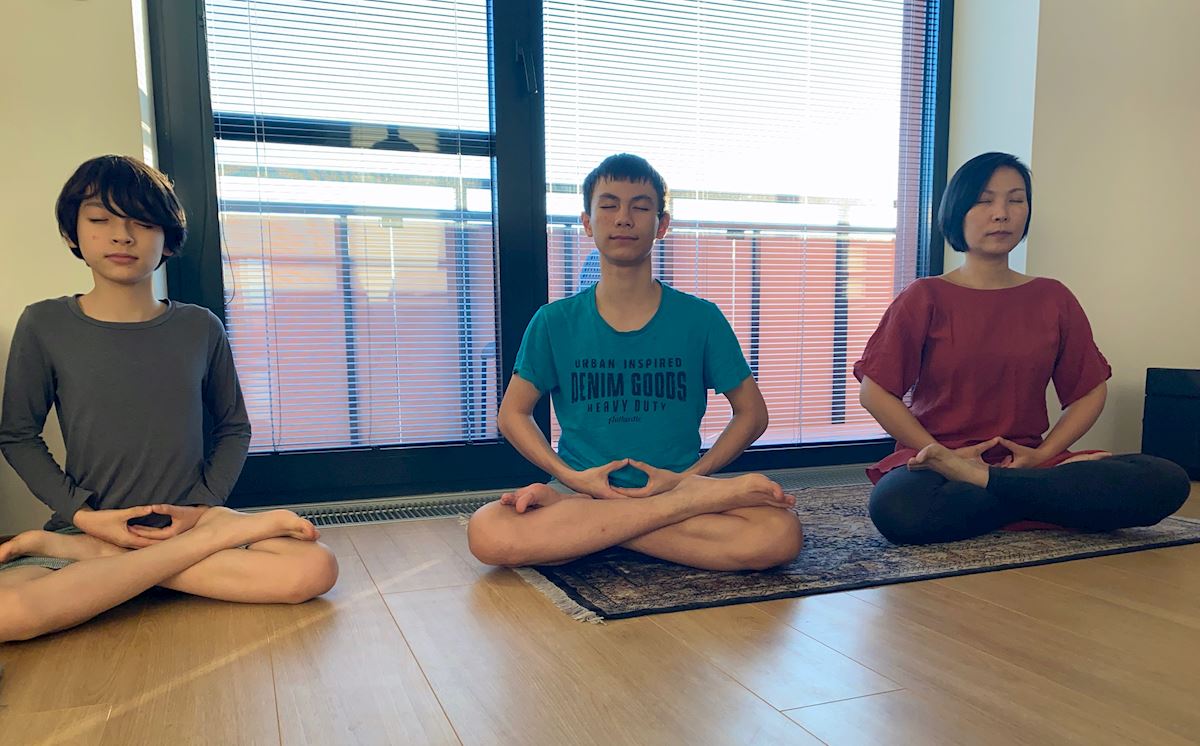 ![]() 图3:苏珊和两个儿子一起炼法轮功的第五套功法——神通加持法。(本人提供) |