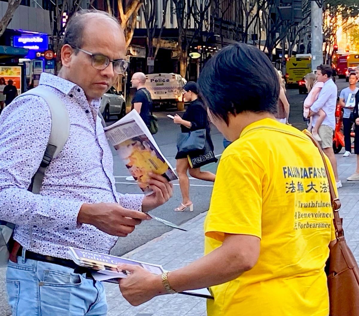 印度裔IT工作者查理(Charlie)来到法轮功活动现场,他与法轮功学员交谈并在征签表上签字后表示:我很了解法轮功所遭受的迫害,我会一直支持你们。