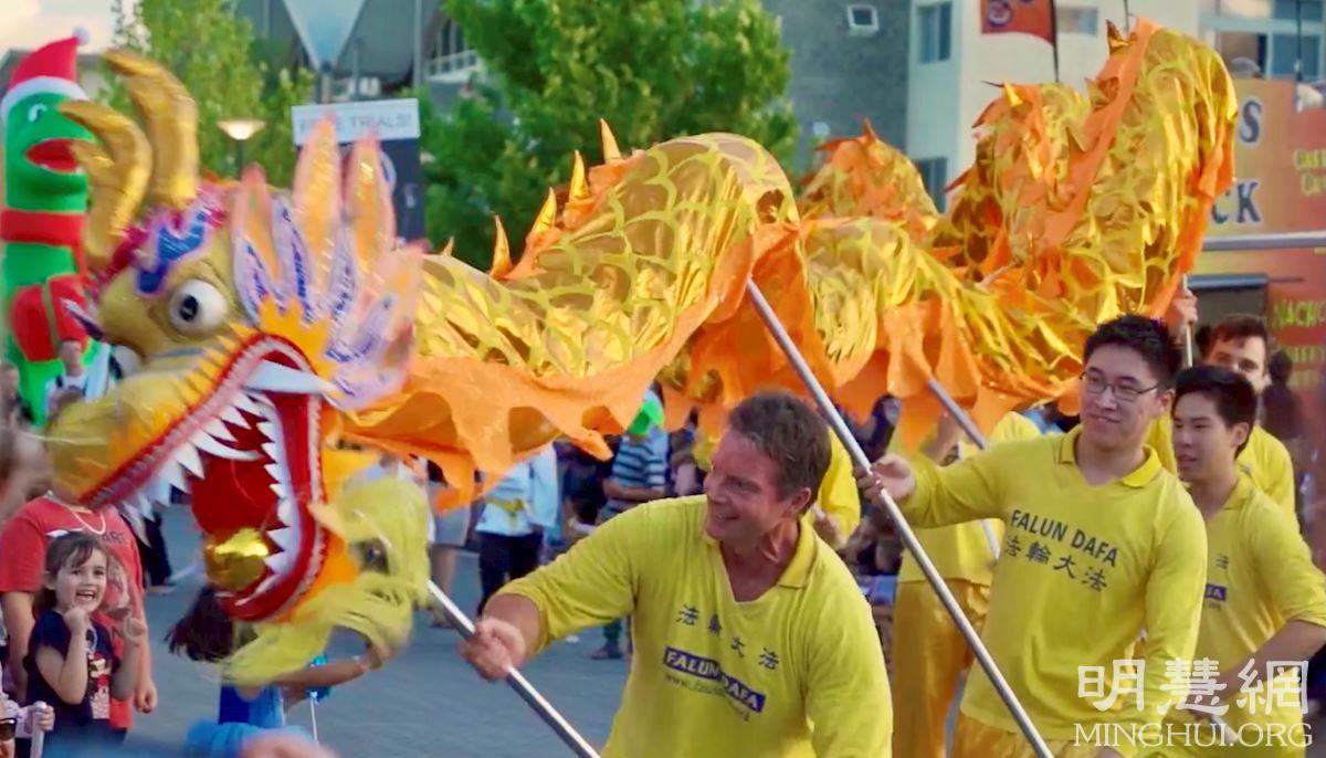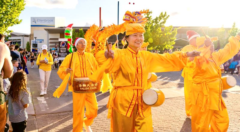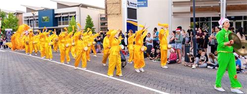 金光灿烂的“法轮大法好”横幅在晴朗的夏日中备受瞩目,带着纯正的能量引领着法轮功学员游行队伍行进在圣诞游行中。优雅美丽的仙女队漫步随后;身着金黄色传统服饰的舞龙队在行进中上下灵动翻腾、舞动着金龙,栩栩如生;腰鼓队铿锵有力的阵阵鼓声一扫疫情阴霾,把喜庆和希望传送给当地民众,为这座城市增添了节日的喜庆气氛。