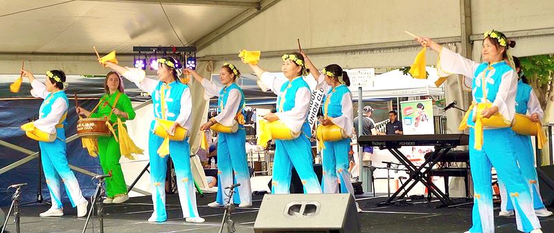 ![]() 图6:法轮功学员在舞台上表演展现中华传统文化的腰鼓舞,神采飞扬。 |