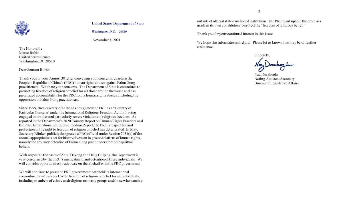 ![]() 图:二零二一年十一月三日,美国国务院给参议员马可・卢比奥(Marco Rubio)的回信。 |