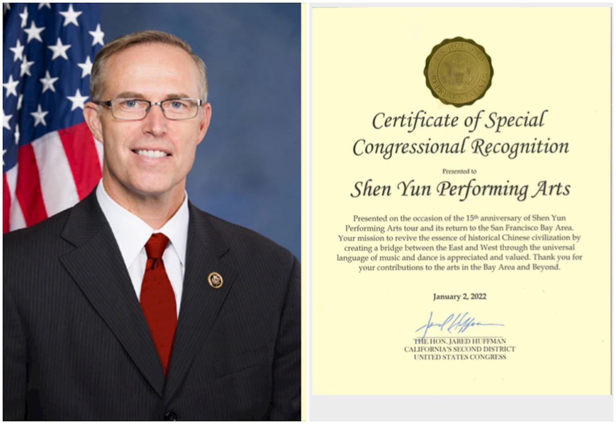 图6:加州国会众议员贾里德·赫夫曼(Jared Huffman)褒奖神韵再临加州旧金山湾区演出。(明慧网合成图片) |